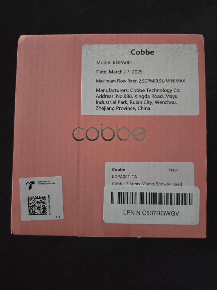 I'm selling a brand new Cobbe 7 Spray Modes Shower Head! It comes in the original box. The model number is KDPA001-CA. Maximum Flow Rate: 2.5GPM(9.5L/MIN)MAX.