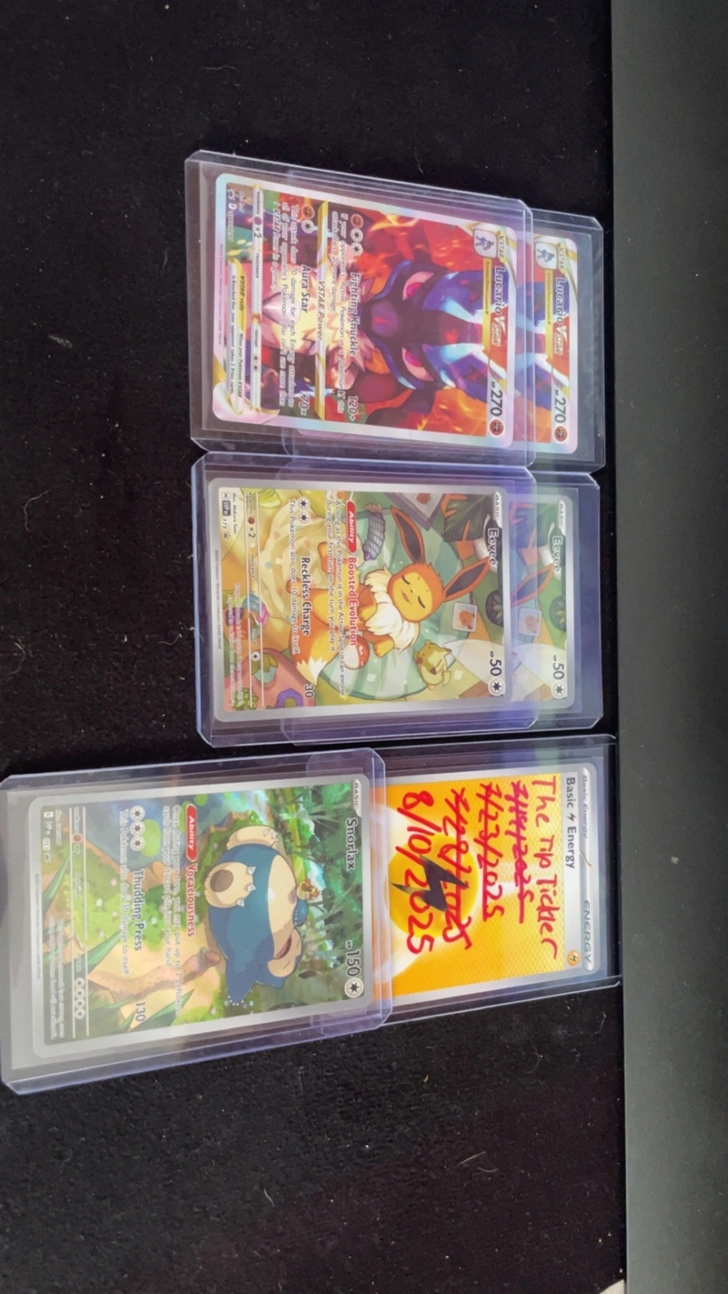 Selling a set of Pokémon cards including Lucario VSTAR, Eevee, and Snorlax. The cards look to be in great shape and ready for a new home!