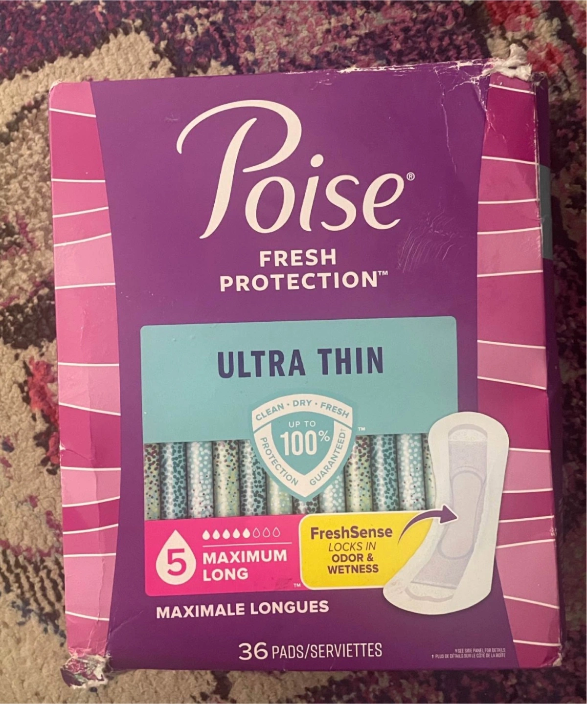 Selling a box of Poise Fresh Protection Ultra Thin pads. This box contains 36 pads with maximum long absorbency. They feature FreshSense technology to lock in odour and wetness. Perfect for everyday use!