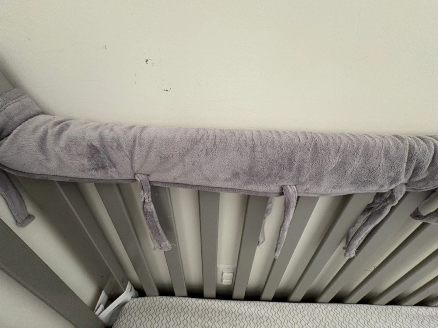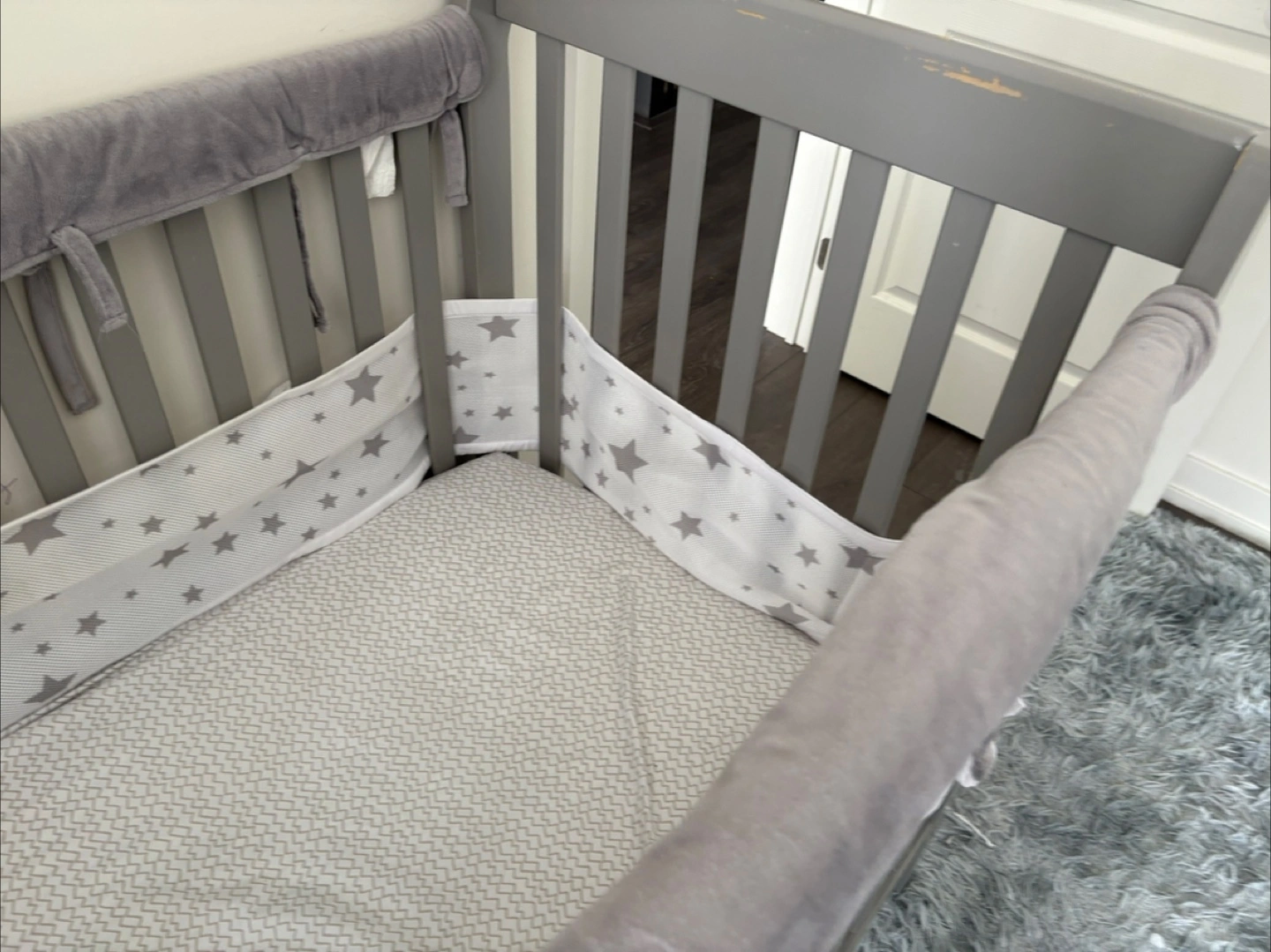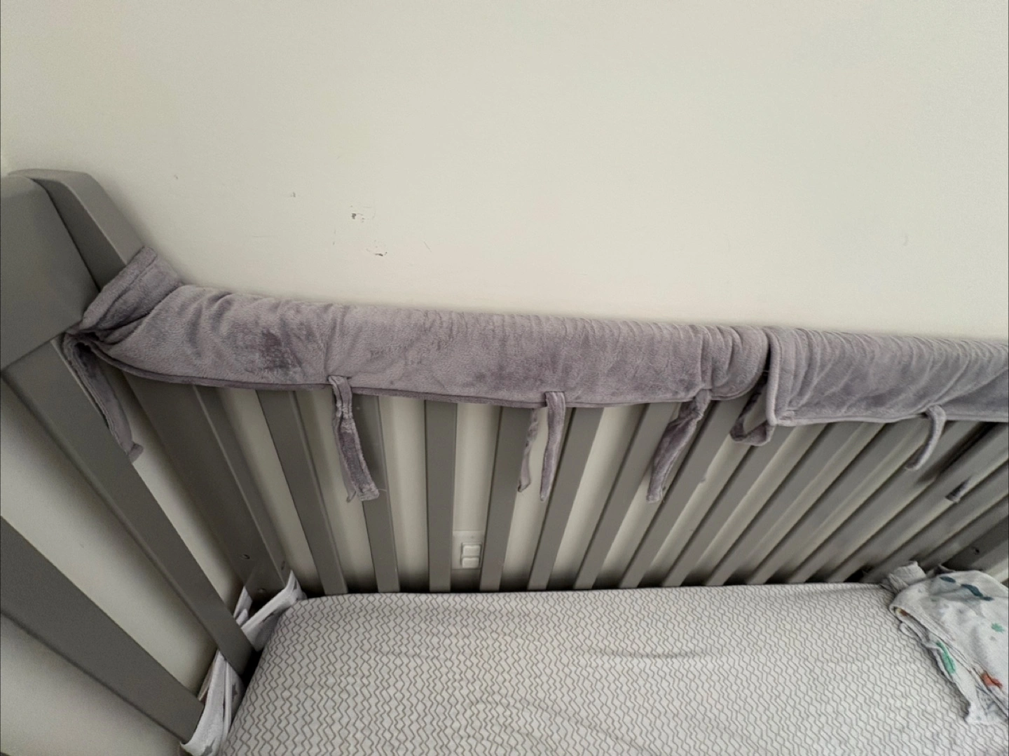 10Selling a grey baby crib that's in good condition. It comes with bumper pads to keep your little one safe and comfy. Perfect for a nursery!