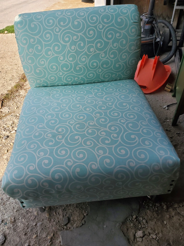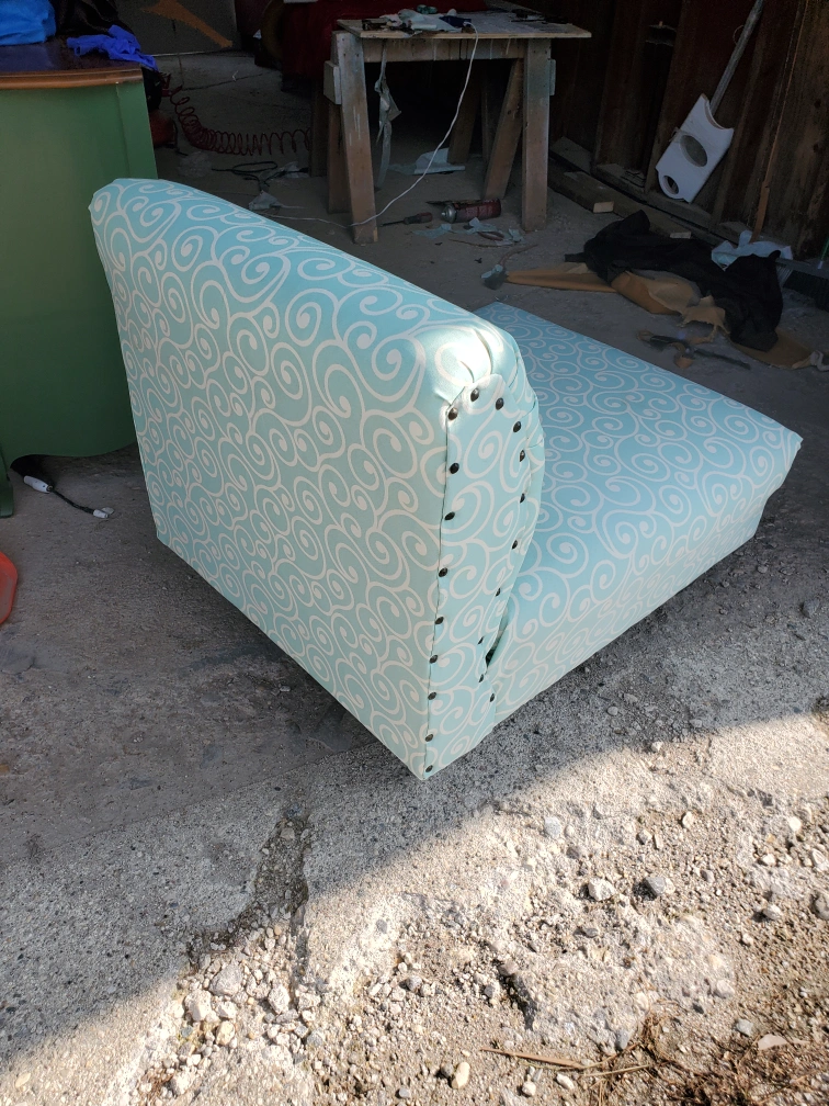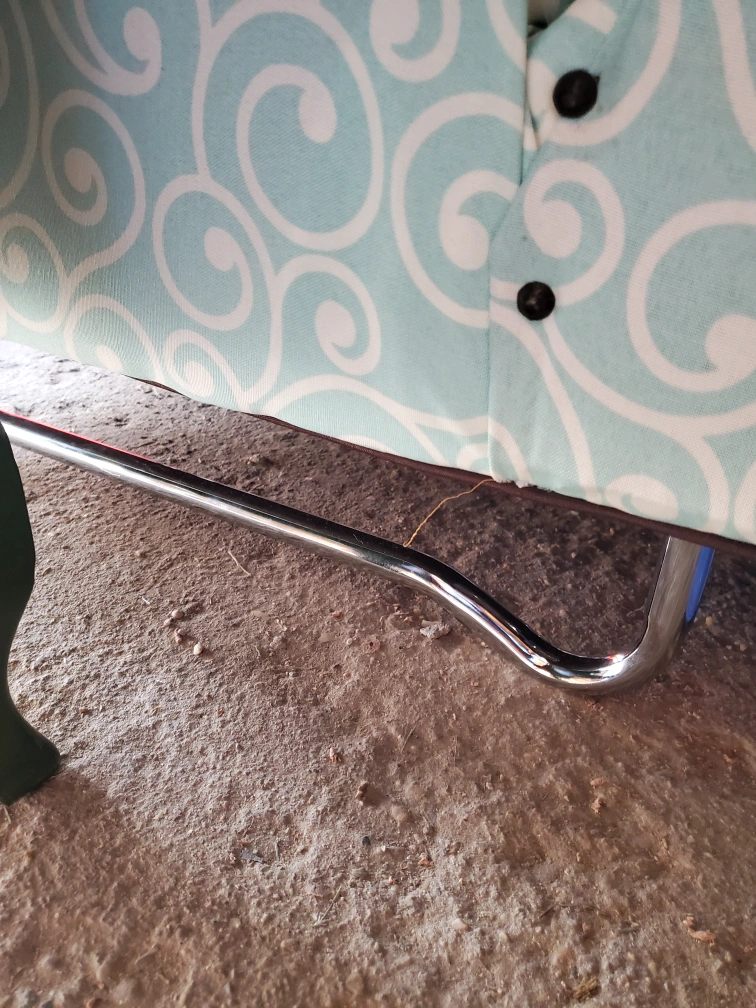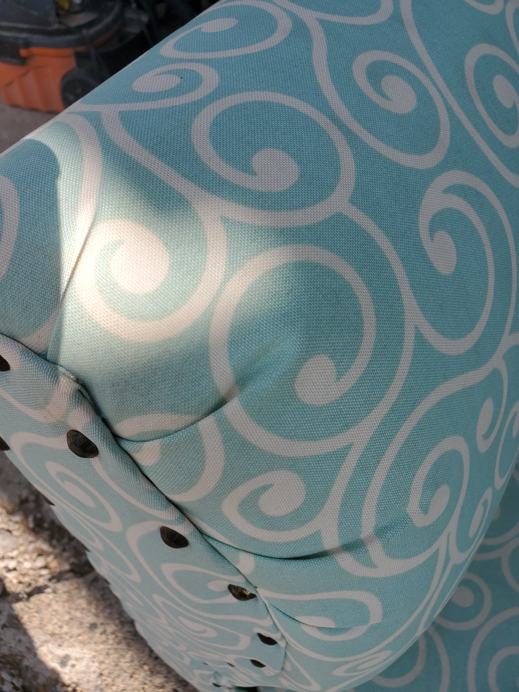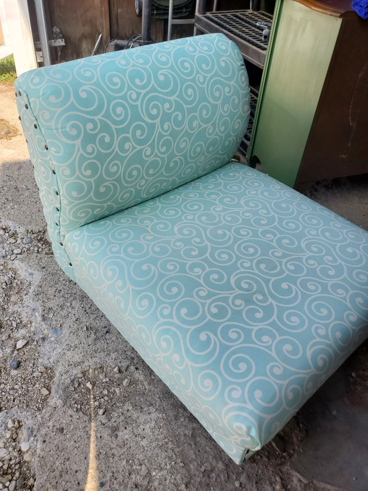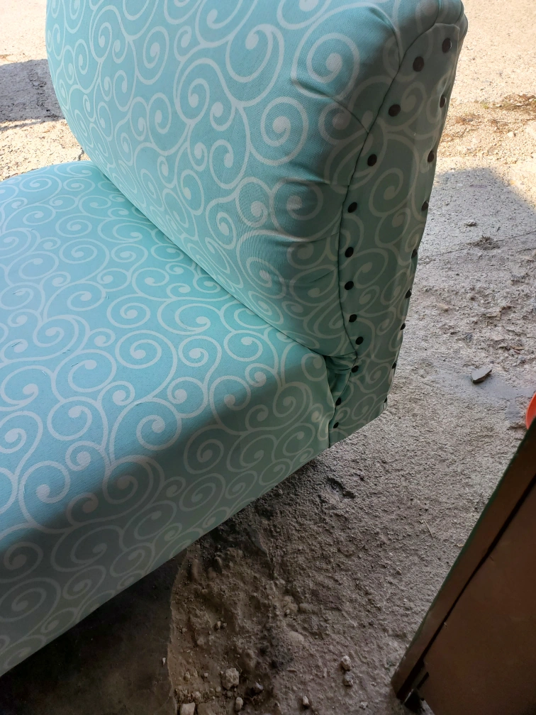 Selling a cute accent chair with a unique turquoise and white swirl pattern. It's in great shape and would be perfect for adding a pop of colour to any room. The chair has a comfortable seat and back, and the decorative nailhead trim adds a touch of elegance it also boasts chrome oblong legs