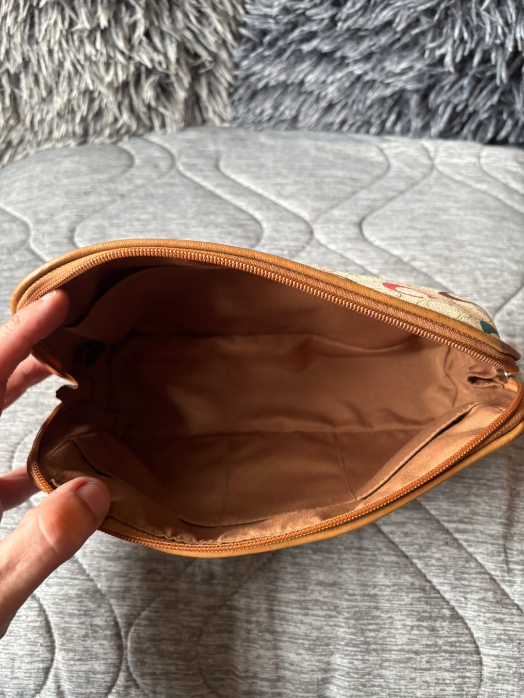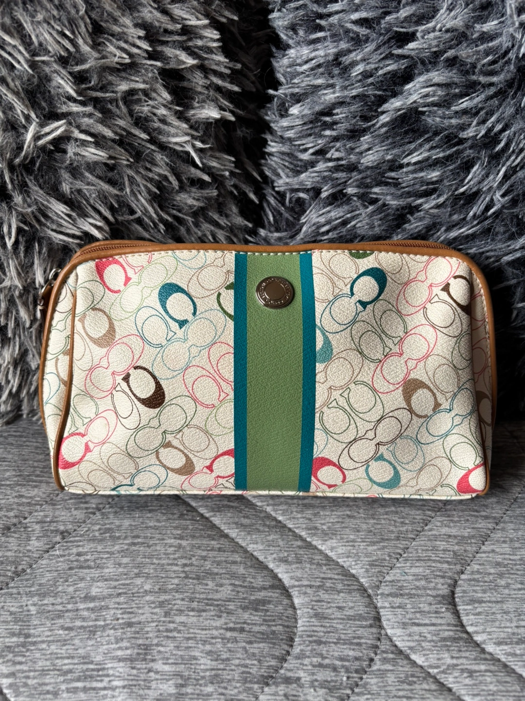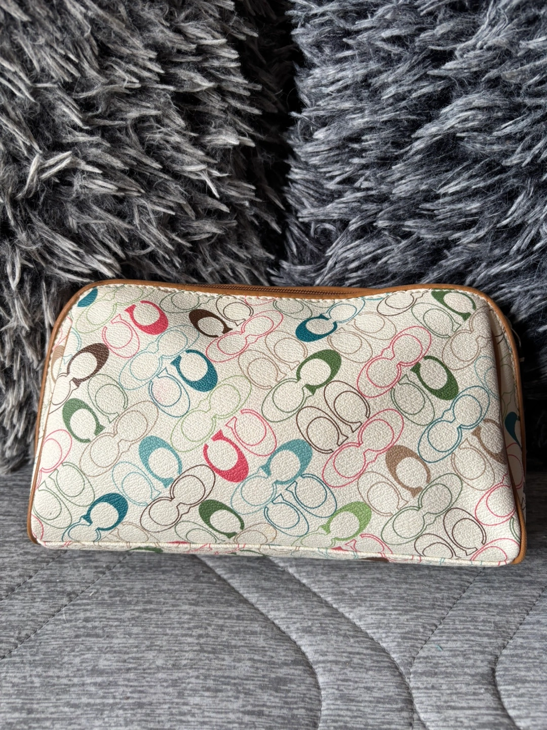 Selling a Coach cosmetic bag in great condition! It features the classic Coach logo pattern in various colours, and a brown trim. Perfect for storing your makeup or toiletries! 10x5.5x2.5. Cash only.