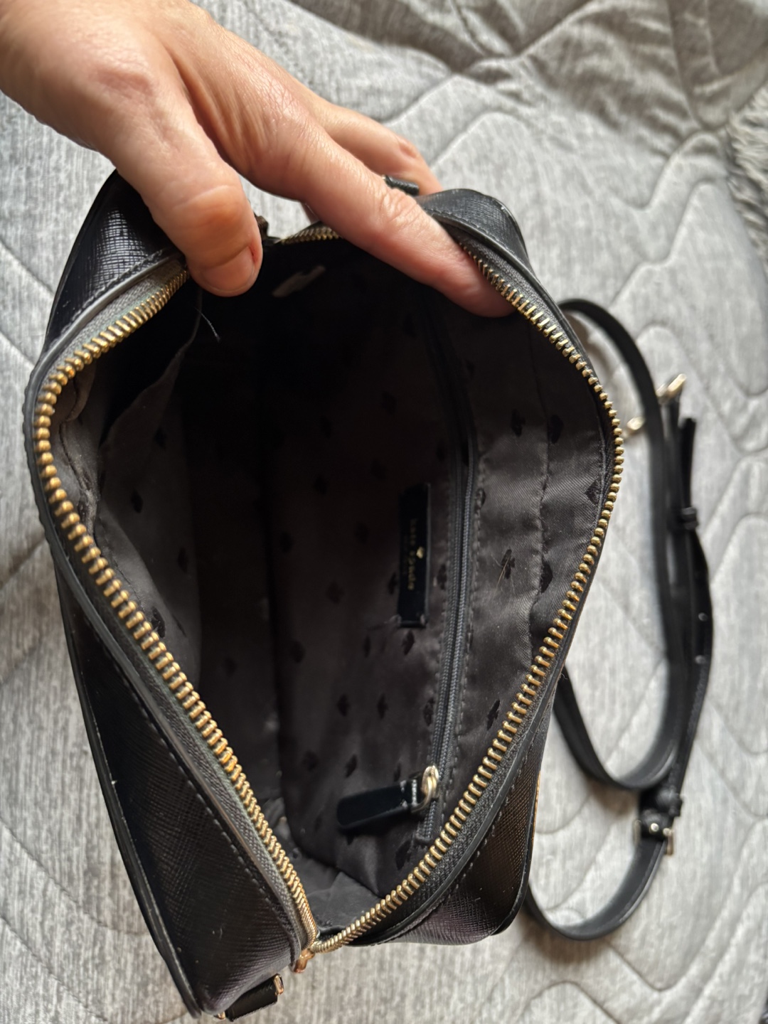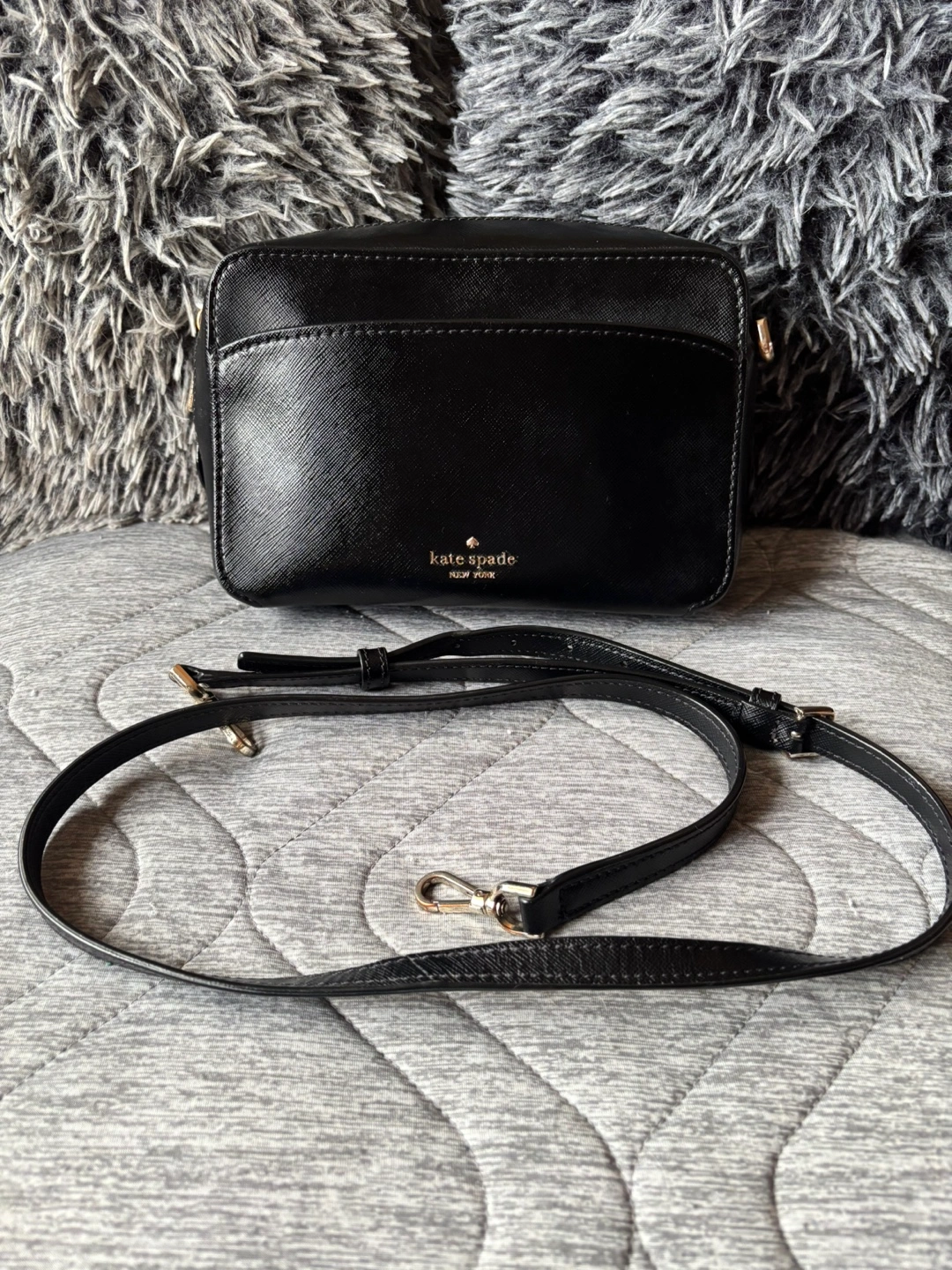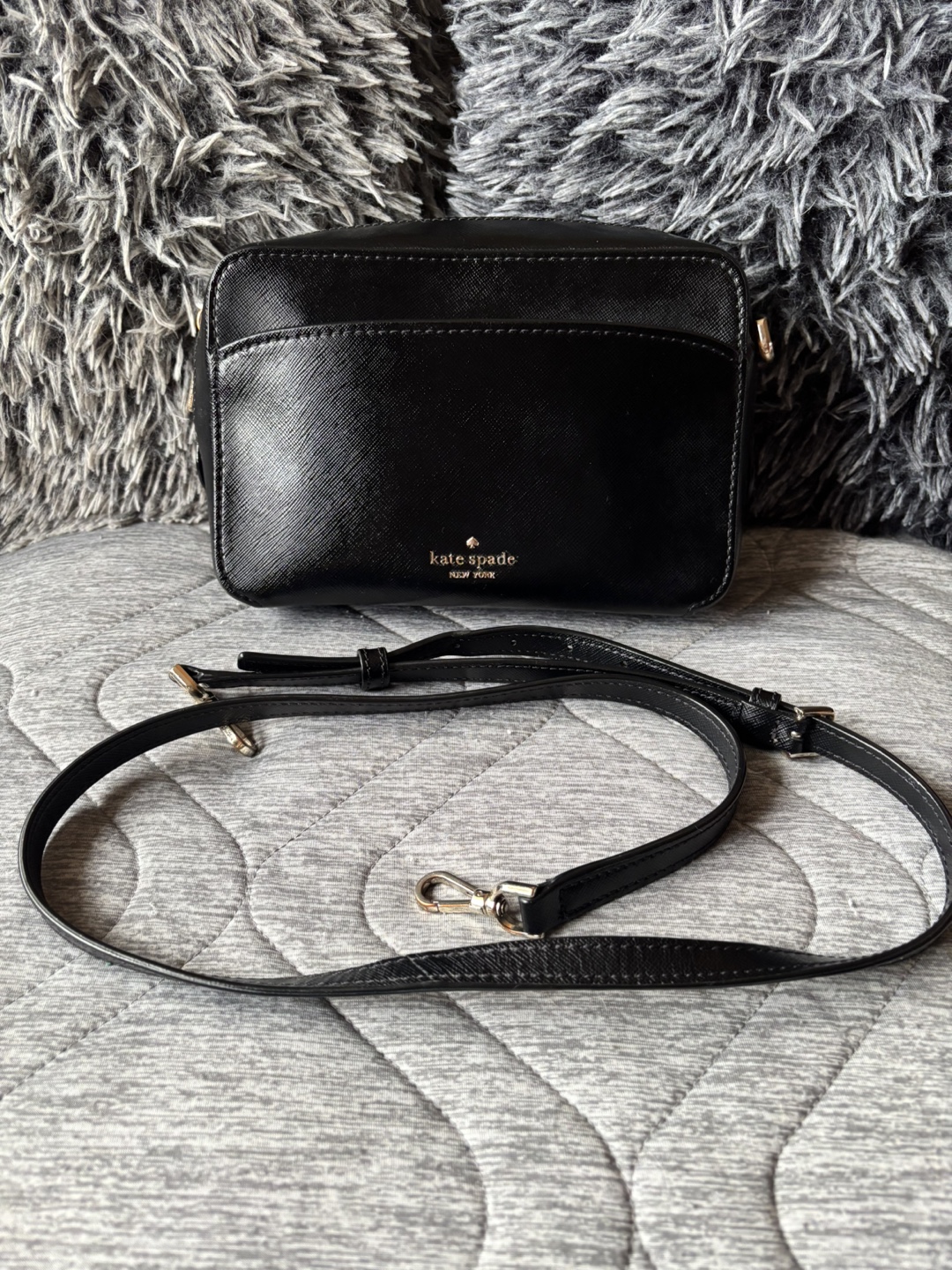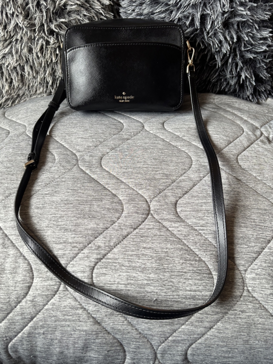 Selling a Kate Spade crossbody bag in black. It's in great condition and perfect for everyday use! The bag features a sleek design with the Kate Spade logo. It also has an adjustable strap for comfortable wear. 9x6.5x3 inches. Cash only.