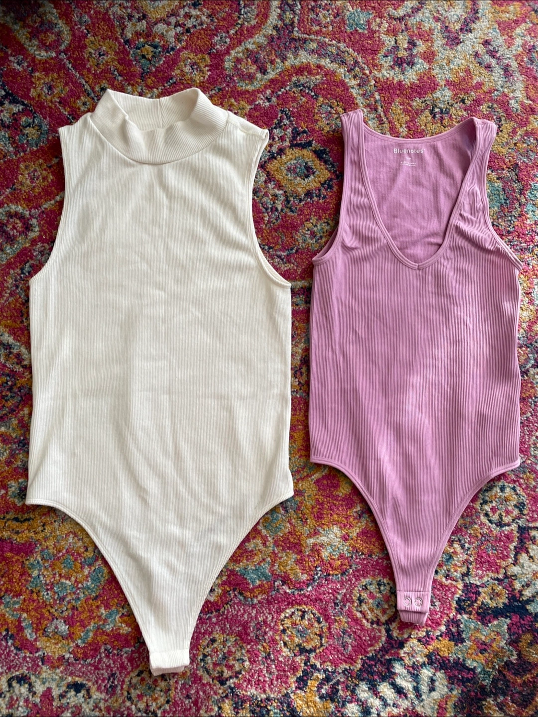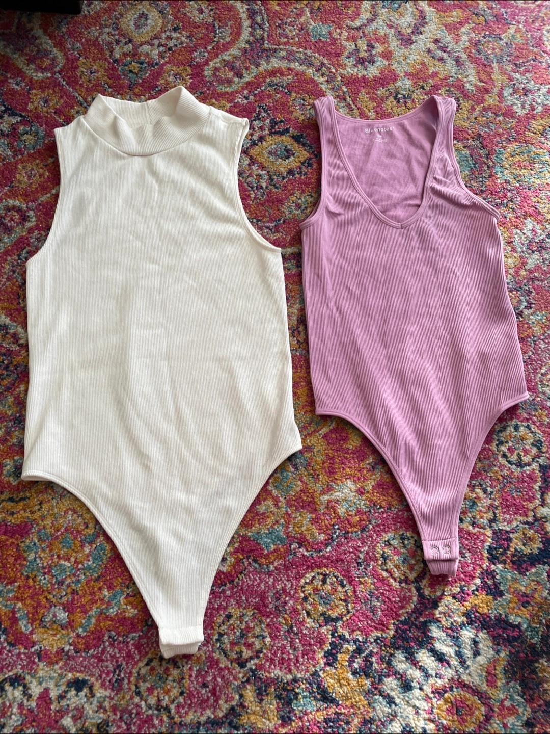 Two cute bodysuits from Bluenotes, both size small. One is a cream colour with a mock neck, and the other is a lilac colour with a v-neck. Both are ribbed and in great condition!
