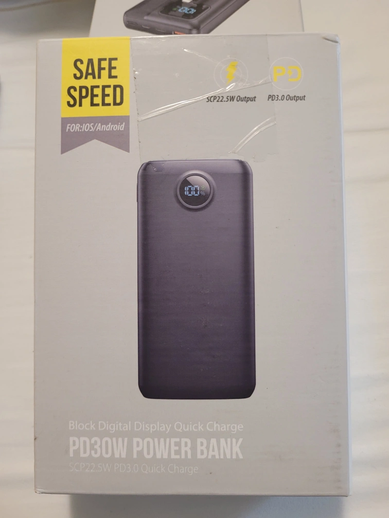 I'm selling a brand new PD30W Power Bank with a block digital display! It features safe speed charging for iOS and Android devices. The power bank supports SCP22.5W and PD3.0 quick charge. It's still in its original box!
