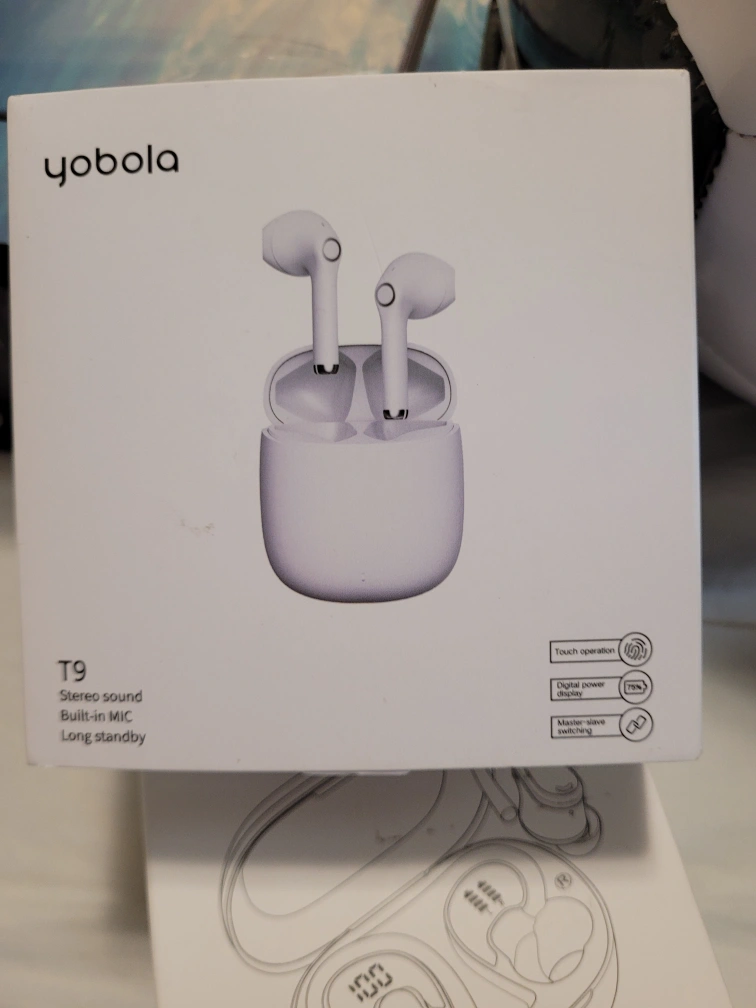 783Selling a pair of Yobola T9 wireless earbuds! They feature stereo sound, a built-in mic, and long standby time. The box also mentions touch operation, digital power display, and master-slave switching
