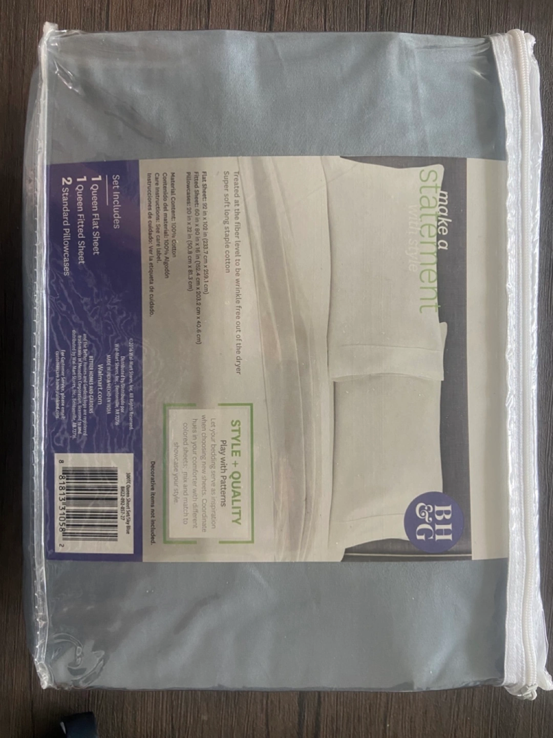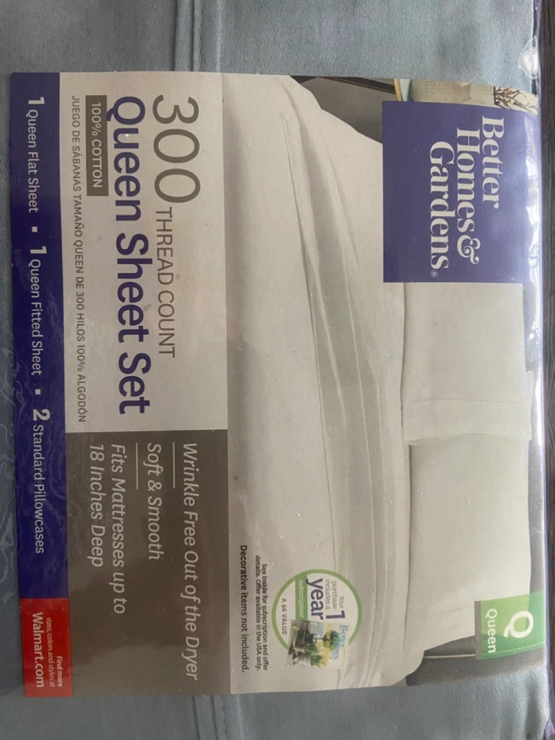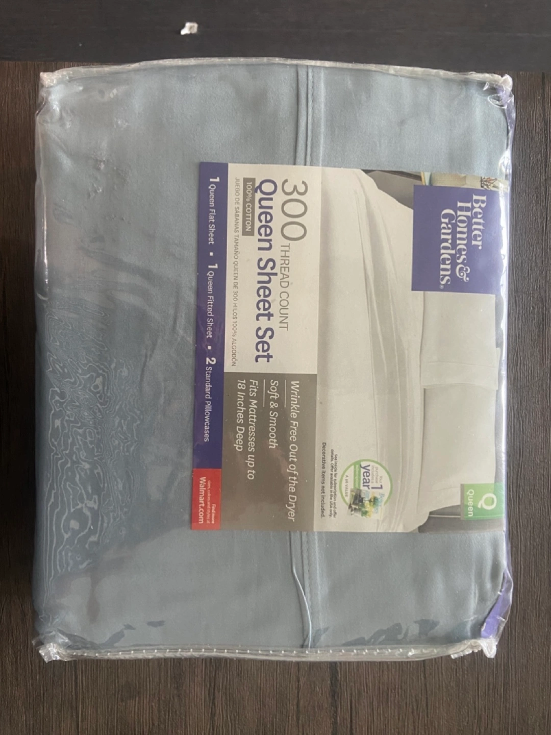 Brand new Better Homes & Gardens 300 thread count queen sheet set! Includes one queen flat sheet, one queen fitted sheet, and two standard pillowcases. Made of 100% cotton and fits mattresses up to 18 inches deep. Super soft and wrinkle-free out of the dryer!