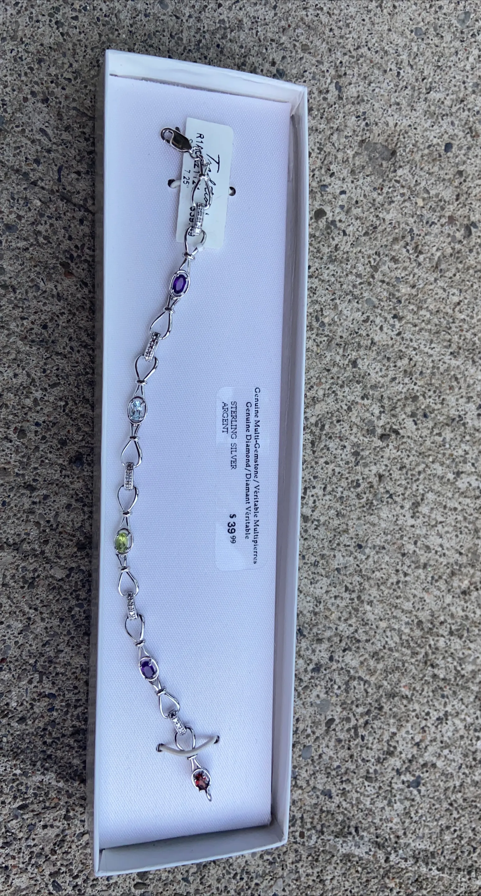 Selling a beautiful sterling silver bracelet featuring genuine multi-gemstones and diamonds. The bracelet is 7.25 inches long and comes in its original box. Originally bought for $39.99