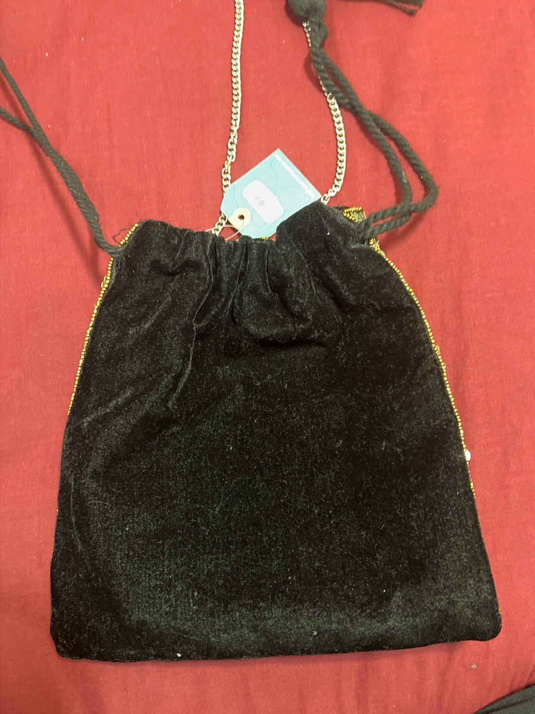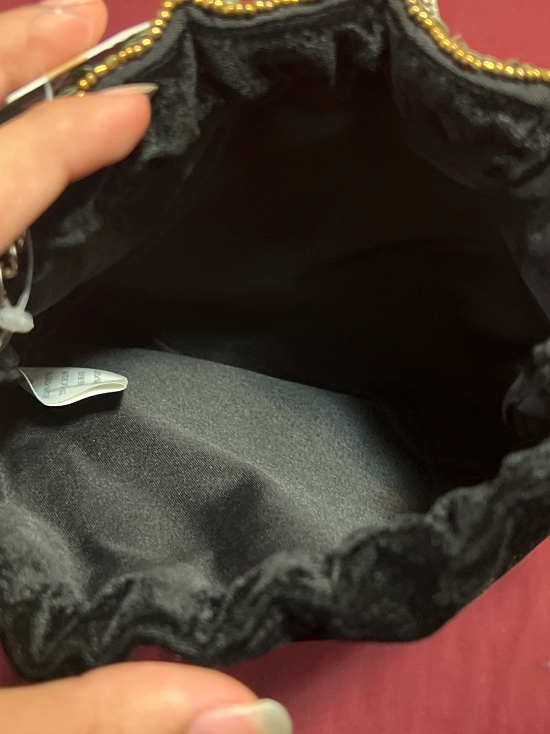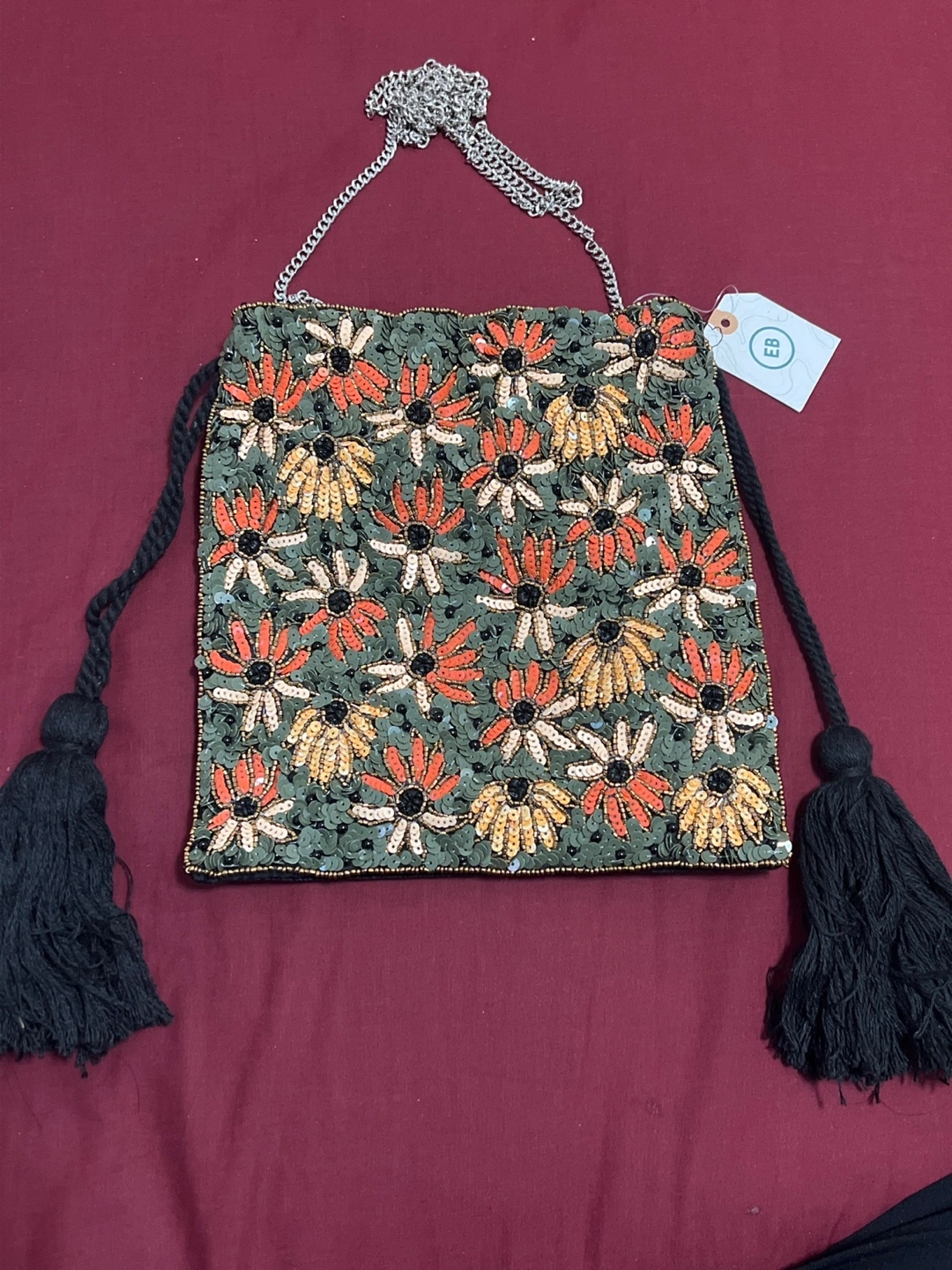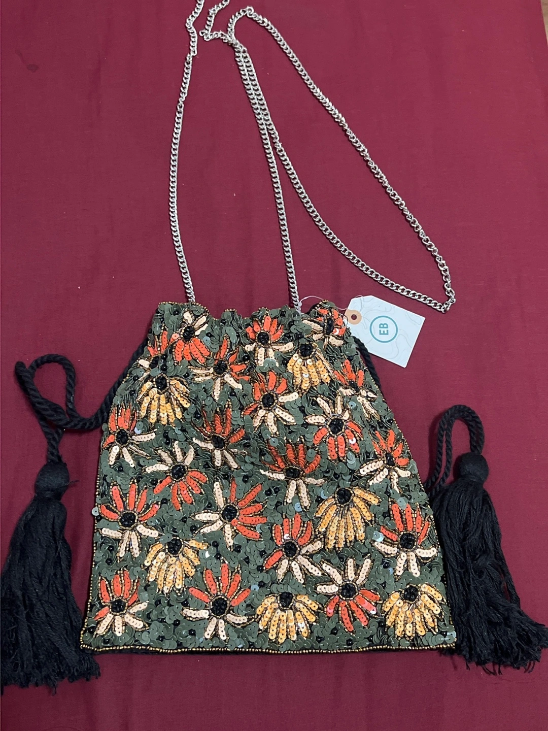 This unique drawstring purse features a gorgeous sequin floral pattern in shades of green, orange, and cream. It's got a silver chain strap and fun black tassels for a bit of flair. The inside is lined with a soft black fabric. Perfect for adding a touch of sparkle to any outfit! New with tags