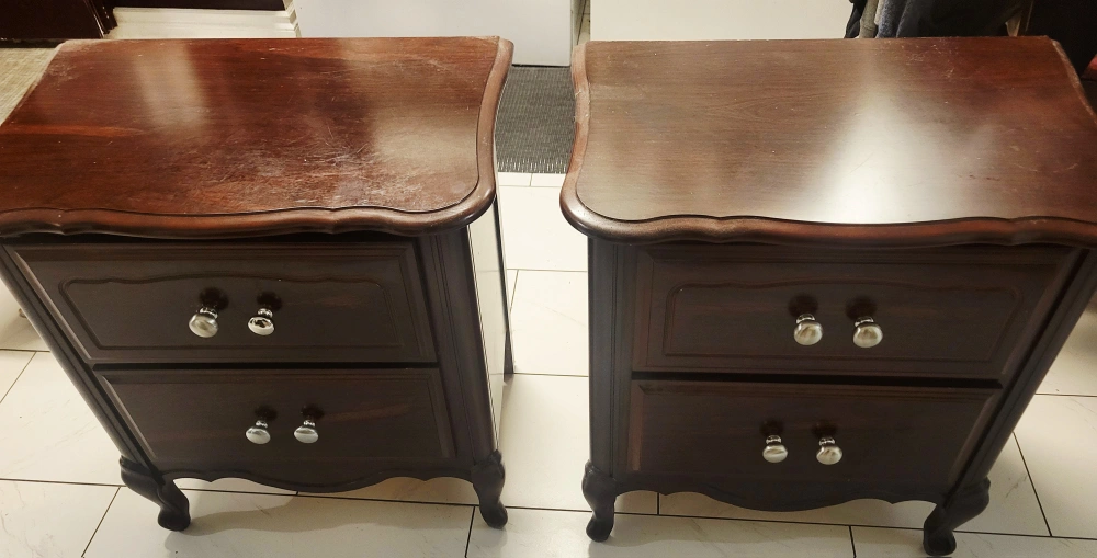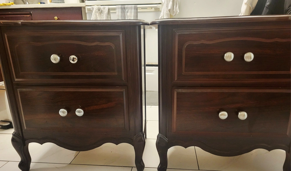 Selling a pair of matching dark wood nightstands. They each have two drawers and decorative silver knobs. They would look great in a bedroom or as side tables in a living room. They are in good condition with some signs of use.x3