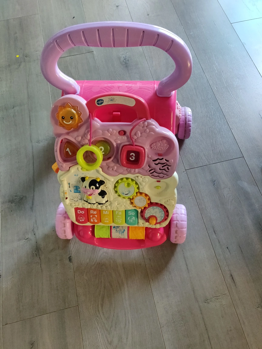 This VTech Sit-to-Stand Learning Walker is perfect for helping your little one take their first steps! It's in great condition and ready for a new home. The walker is pink and features lots of fun activities and sounds to keep your child entertained as they learn to walk.