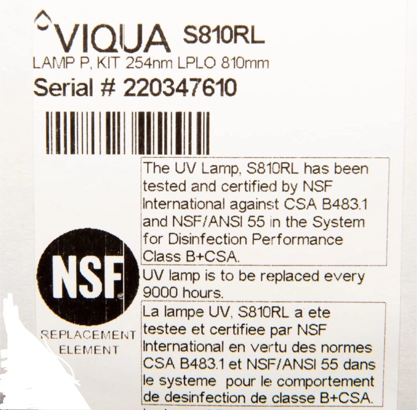 Selling VIQUA S810RL UV Lamp. This lamp is a replacement element for water disinfection systems. It has been tested and certified by NSF International against CSA B483.1 and NSF/ANSI 55 for disinfection performance, Class B+CSA. The UV lamp should be replaced every 9000 hours. I don’t need it anymore.