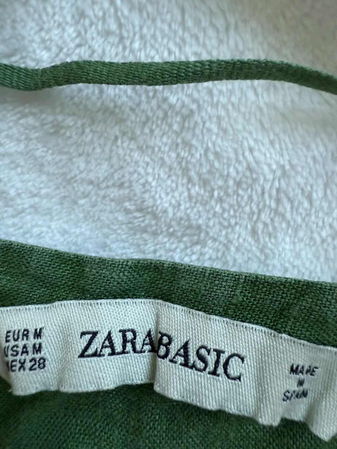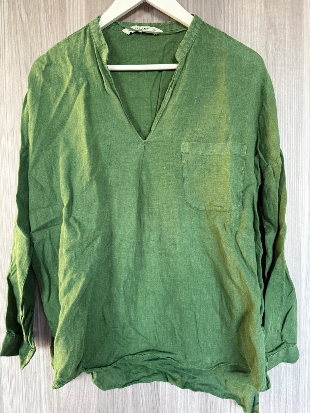 23Selling a gently used Zara Basic blouse in a lovely green linen material. It's a size M and has a comfortable, relaxed fit. Perfect for a casual day out or dressed up for a more polished look!