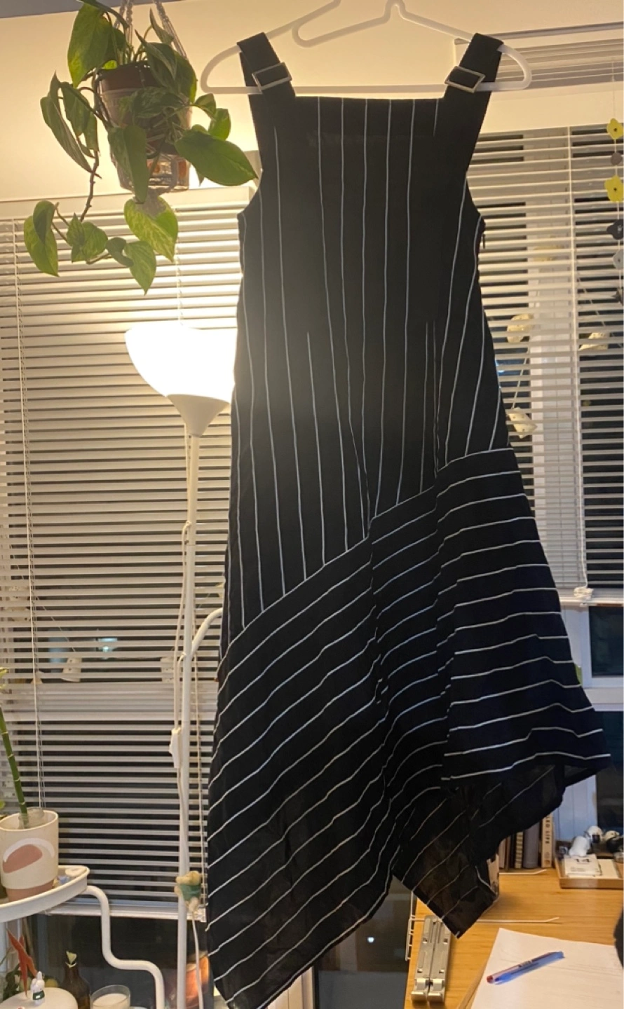 Selling a Moussy dress in a stylish black and white striped pattern! The dress features a unique asymmetrical design. Perfect for a chic, modern look