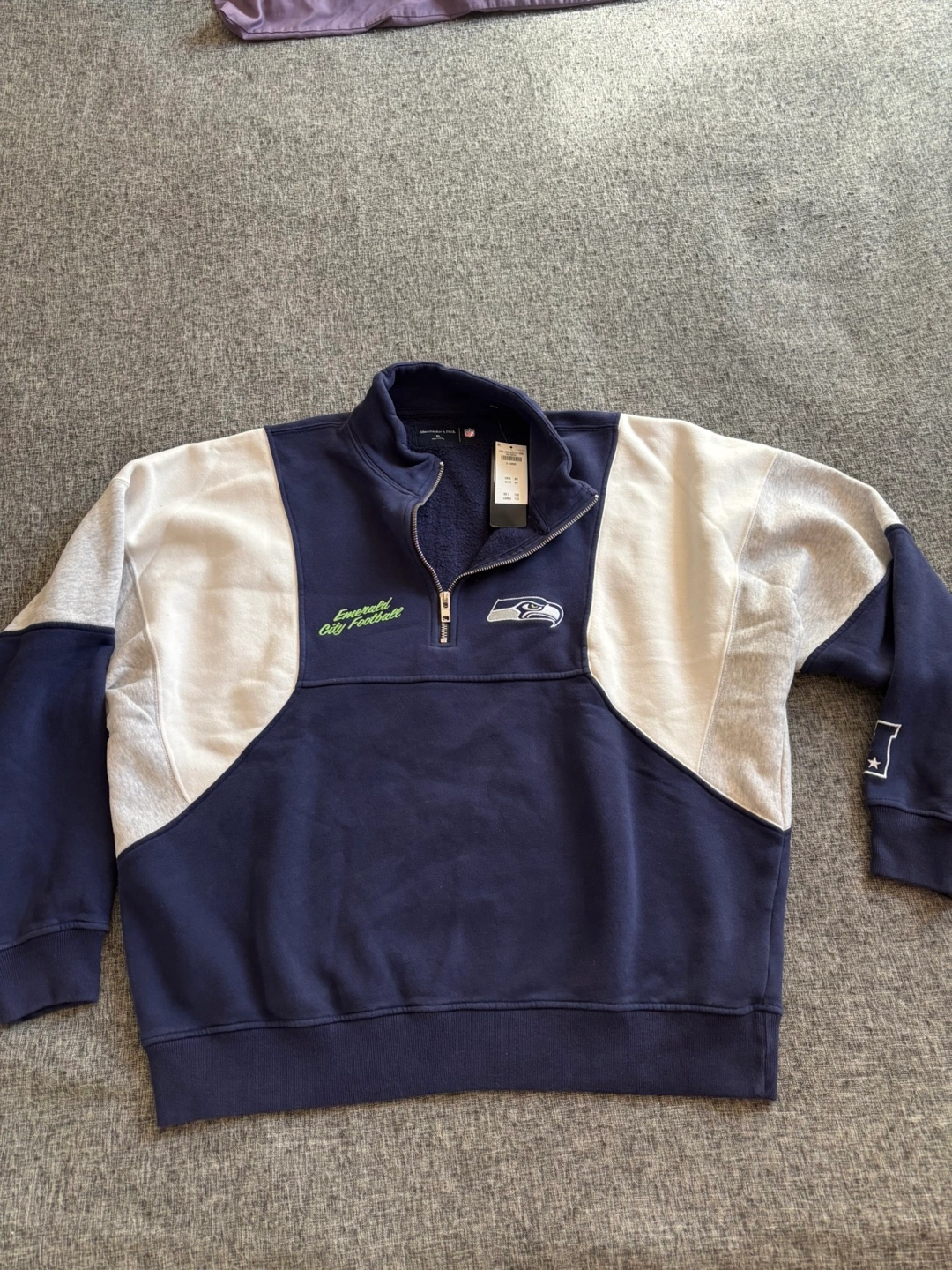 Here's an Abercrombie & Fitch NFL Seattle Seahawks pullover in size XL! It's in new condition with tags still attached. The colours are navy, grey, and white. A great addition to any Seahawks fan's wardrobe!