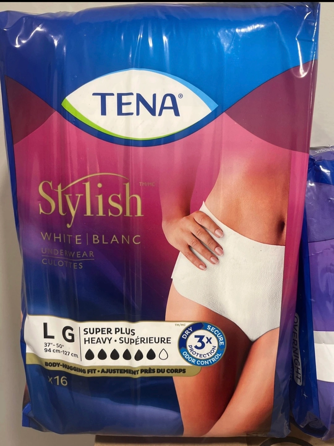 Selling TENA Stylish underwear, size large and medium. These are super plus absorbency and provide 3x protection for dryness and odour control. Each pack contains 16 underwear. Perfect for body-hugging fit and discreet protection.