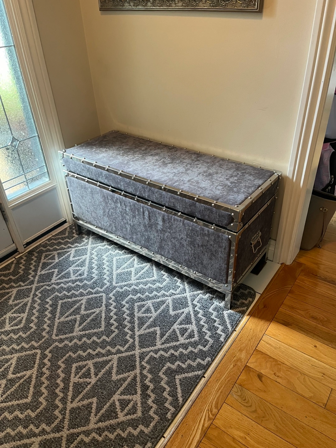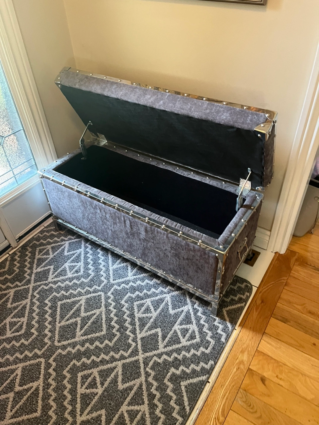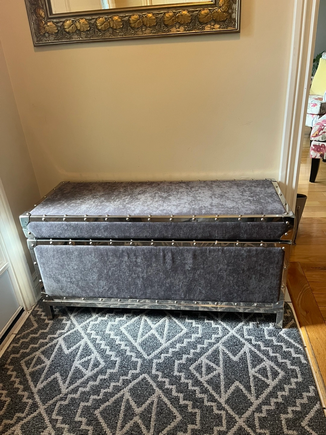 Selling a stylish grey storage trunk! It's in great shape and perfect for adding some flair and extra storage to your home. It would be great as a bench or for storing blankets or toys. It's a really versatile piece! One foot is missing the bottom.
