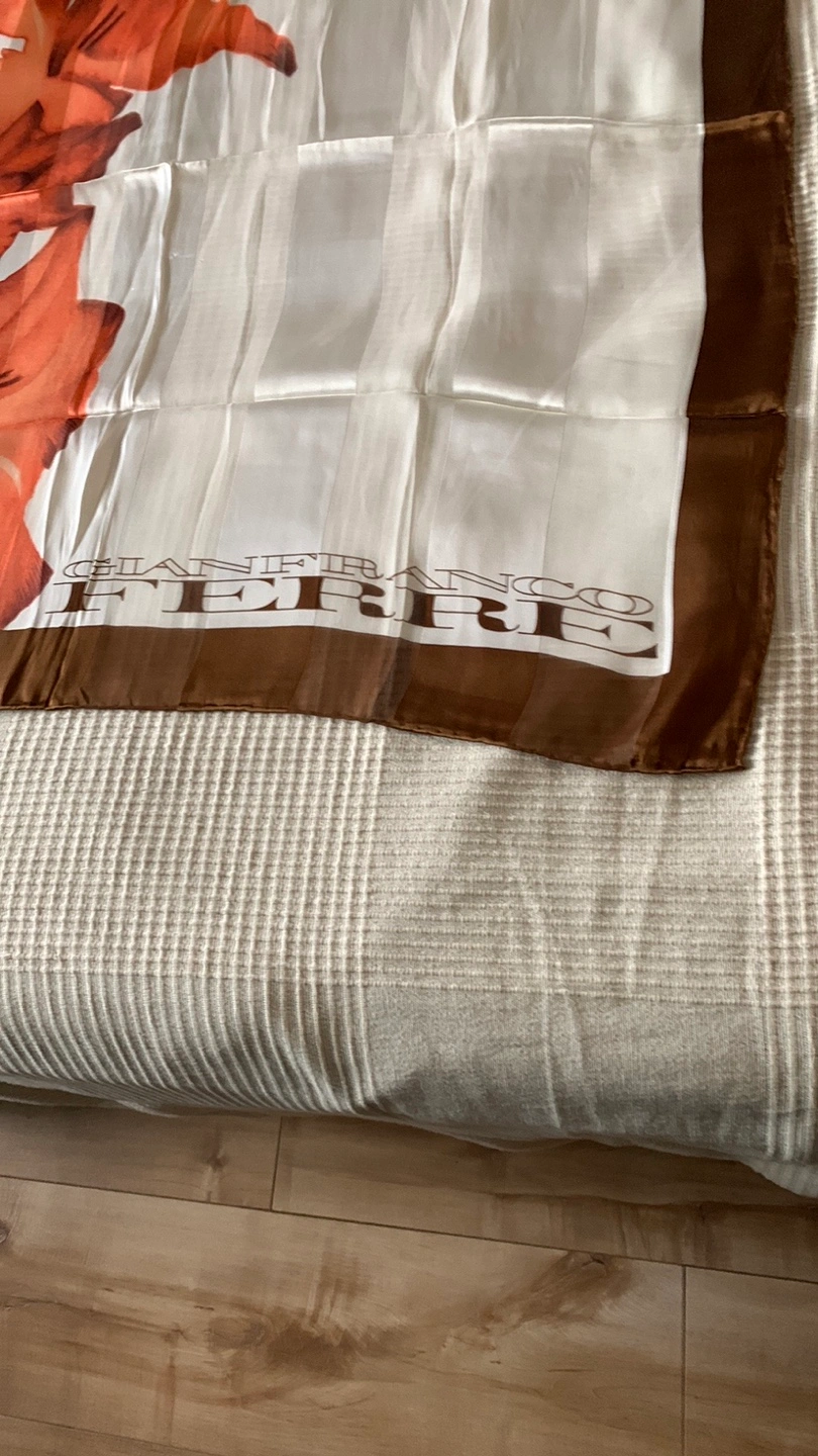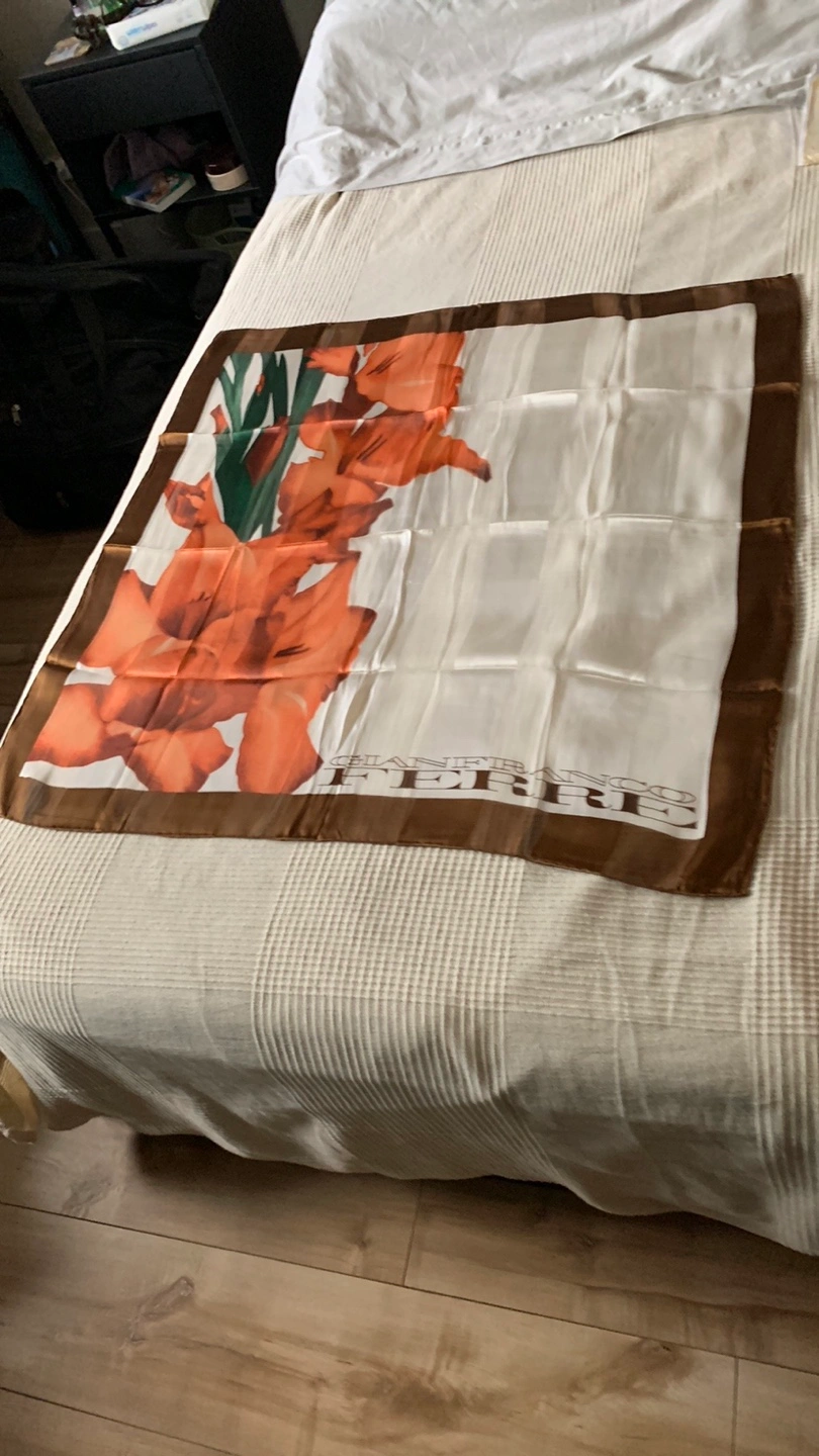 Selling a beautiful silk scarf from Gianfranco Ferre. It features a lovely floral design in shades of orange and green, set against a cream and brown border. Perfect for adding a touch of elegance to any outfit!