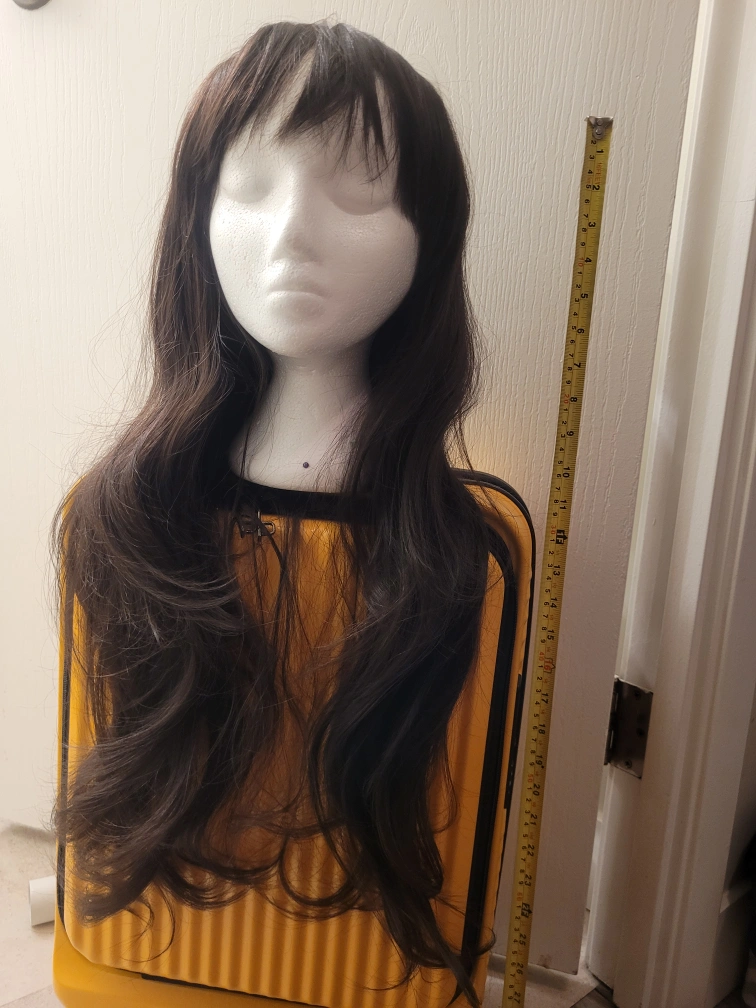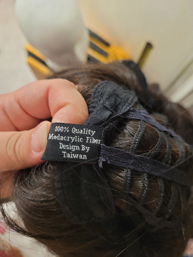 Selling a wavy brown wig made of 100% quality modacrylic fiber. It's designed in Taiwan and measures approximately 28 inches in length.