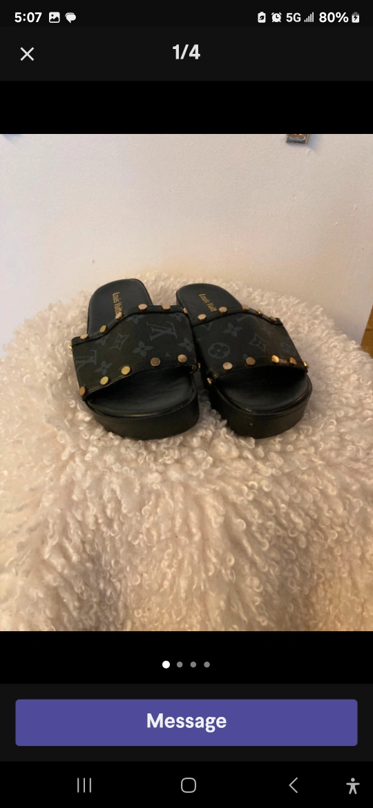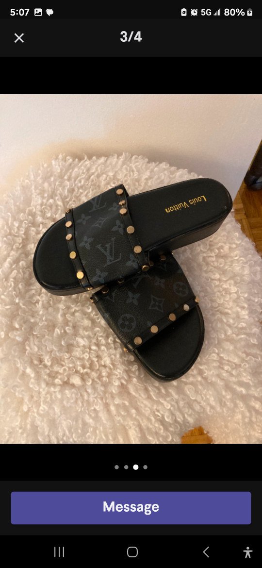 These stylish slides feature the iconic monogram pattern embossed on the upper strap. They have gold-tone stud accents and a comfortable, flat sole. Perfect for adding a touch of luxury to your casual look!