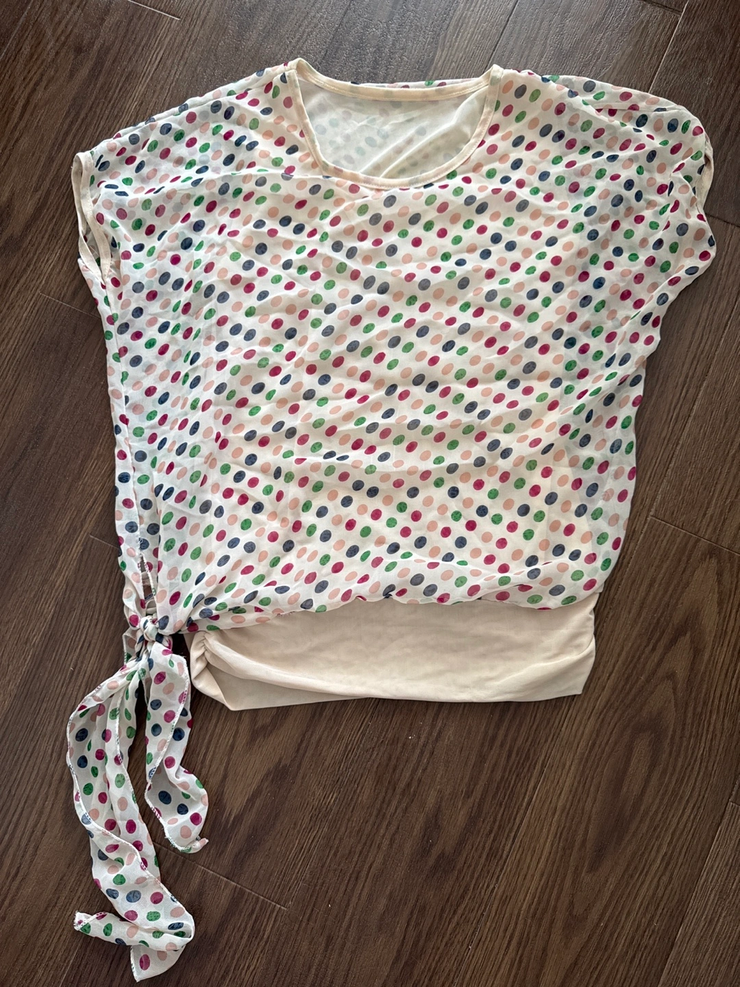 610Cute polka dot blouse with a tie detail! It's in great condition and perfect for adding a pop of colour to your wardrobe