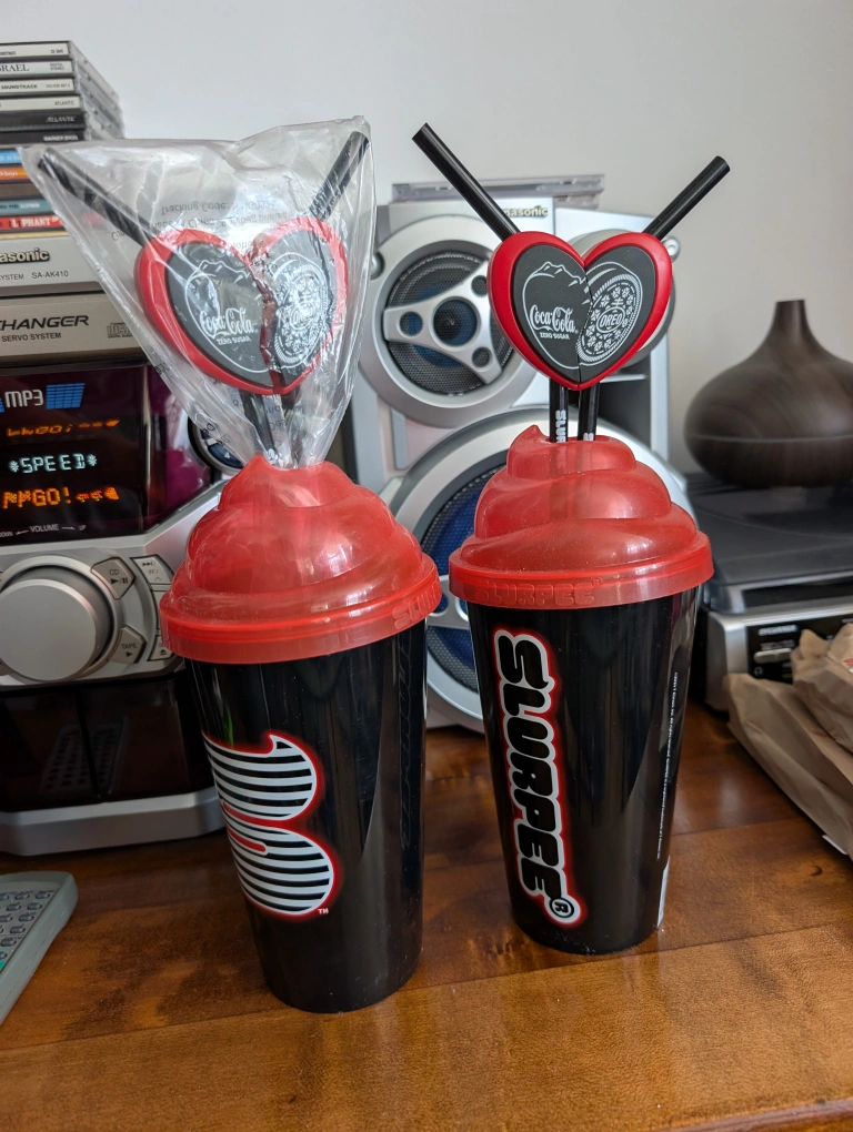 150Two collectible Slurpee cups with Coca-Cola heart-shaped toppers and straws! Never used. Great for collectors or Slurpee enthusiasts!