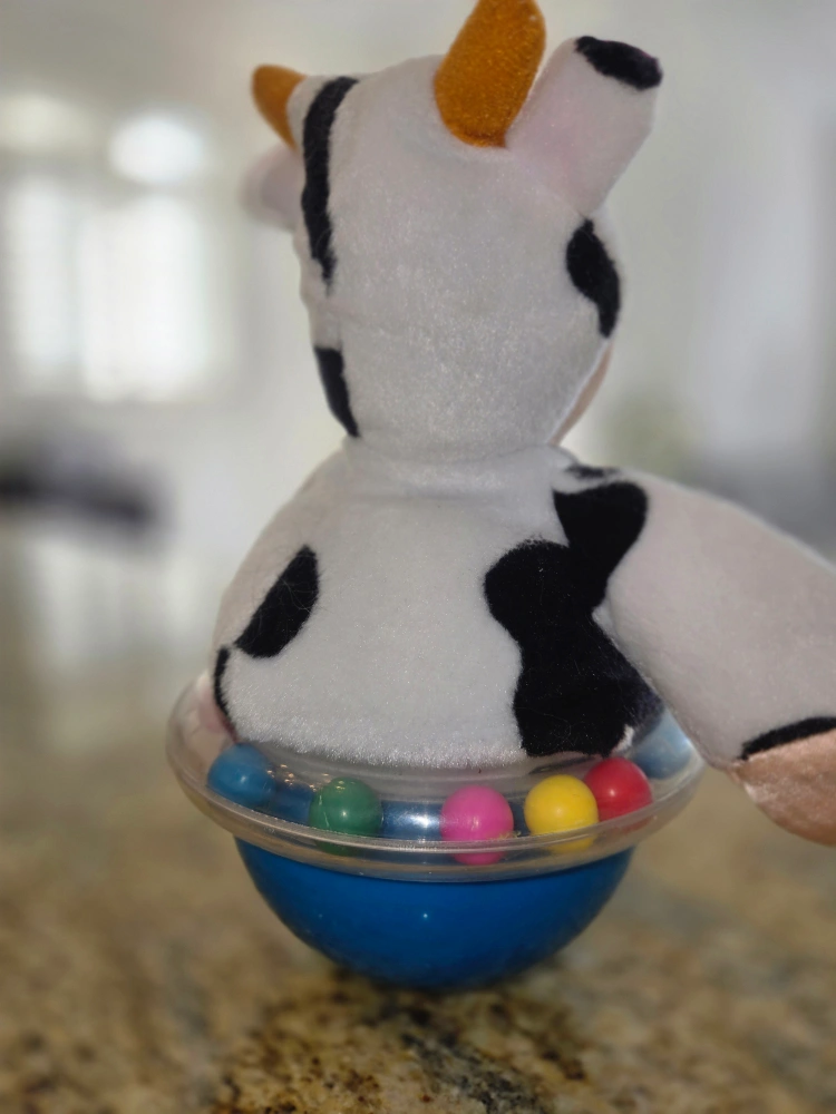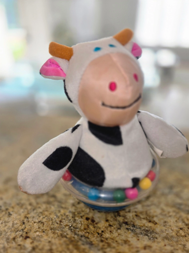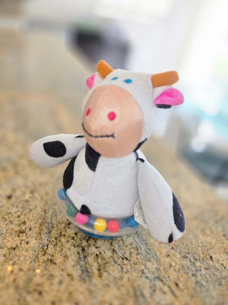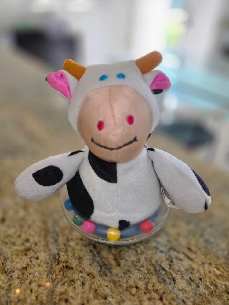 This is a cute cow plush rattle toy! It's in great shape and ready for a new home. It features a soft plush cow design with a clear plastic base containing colourful rattle balls. A fun and engaging toy for little ones!