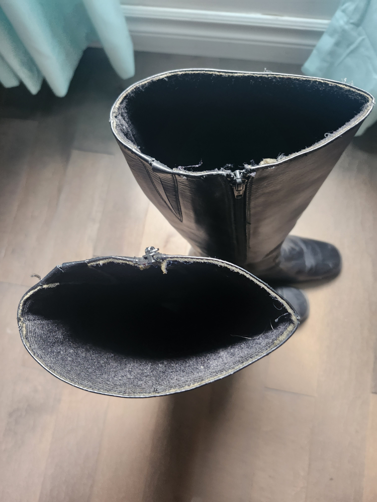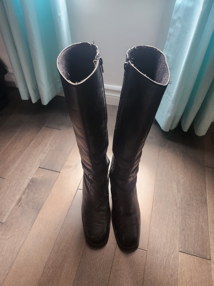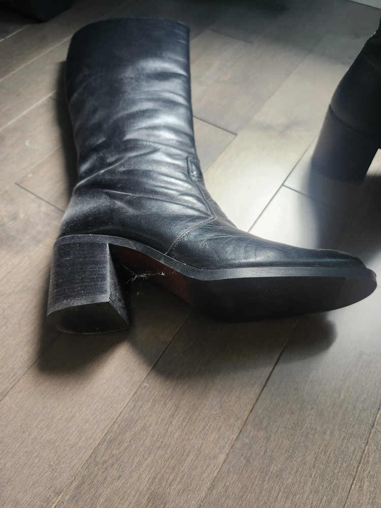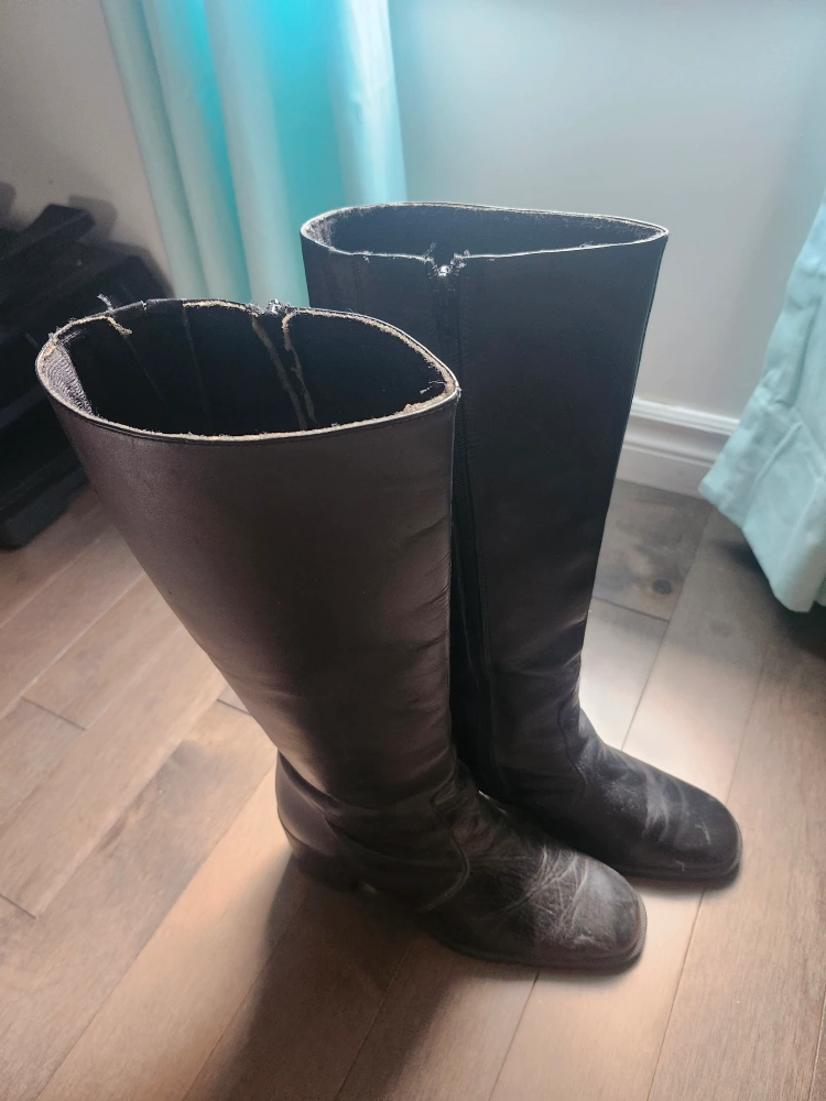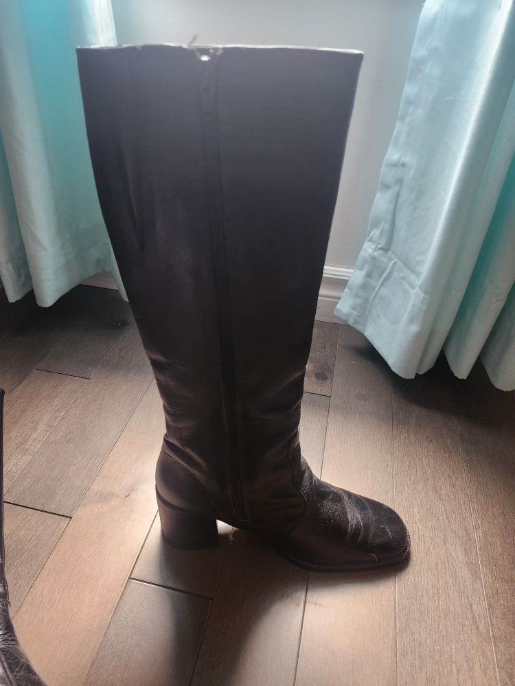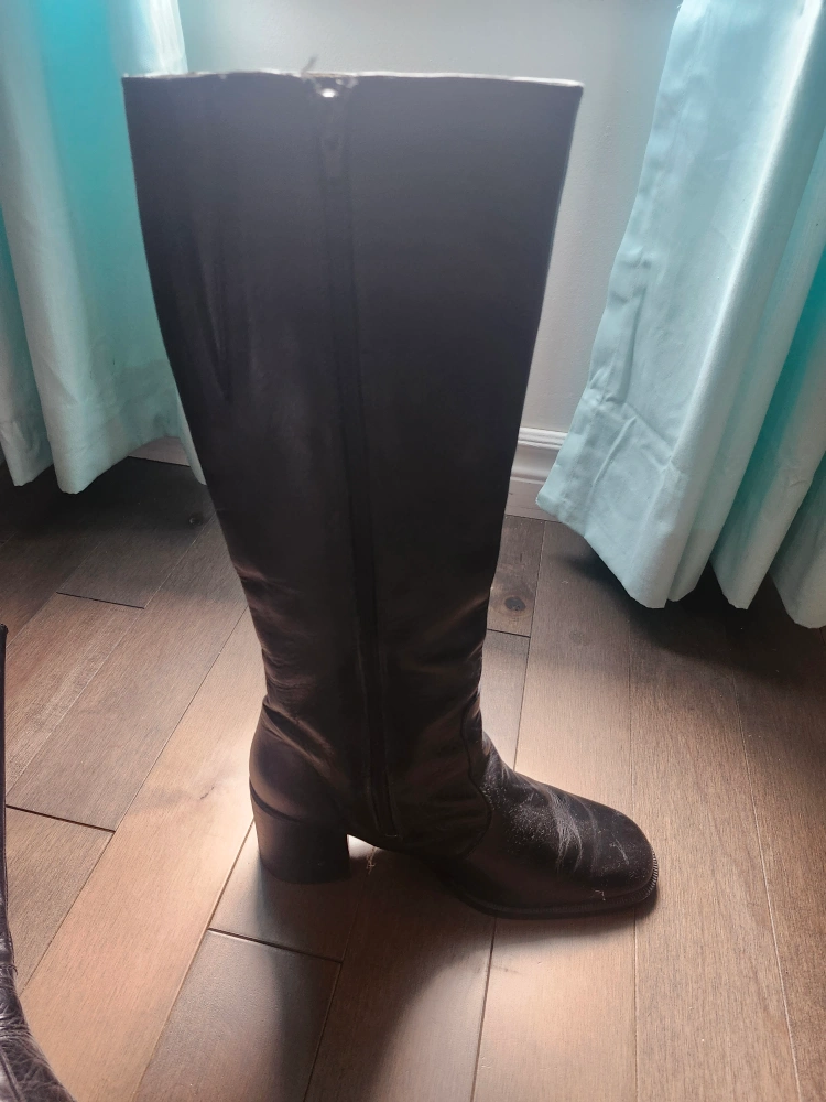 Here are some black knee-high boots! They have a zipper on the side. They show some signs of wear. it's leatherk