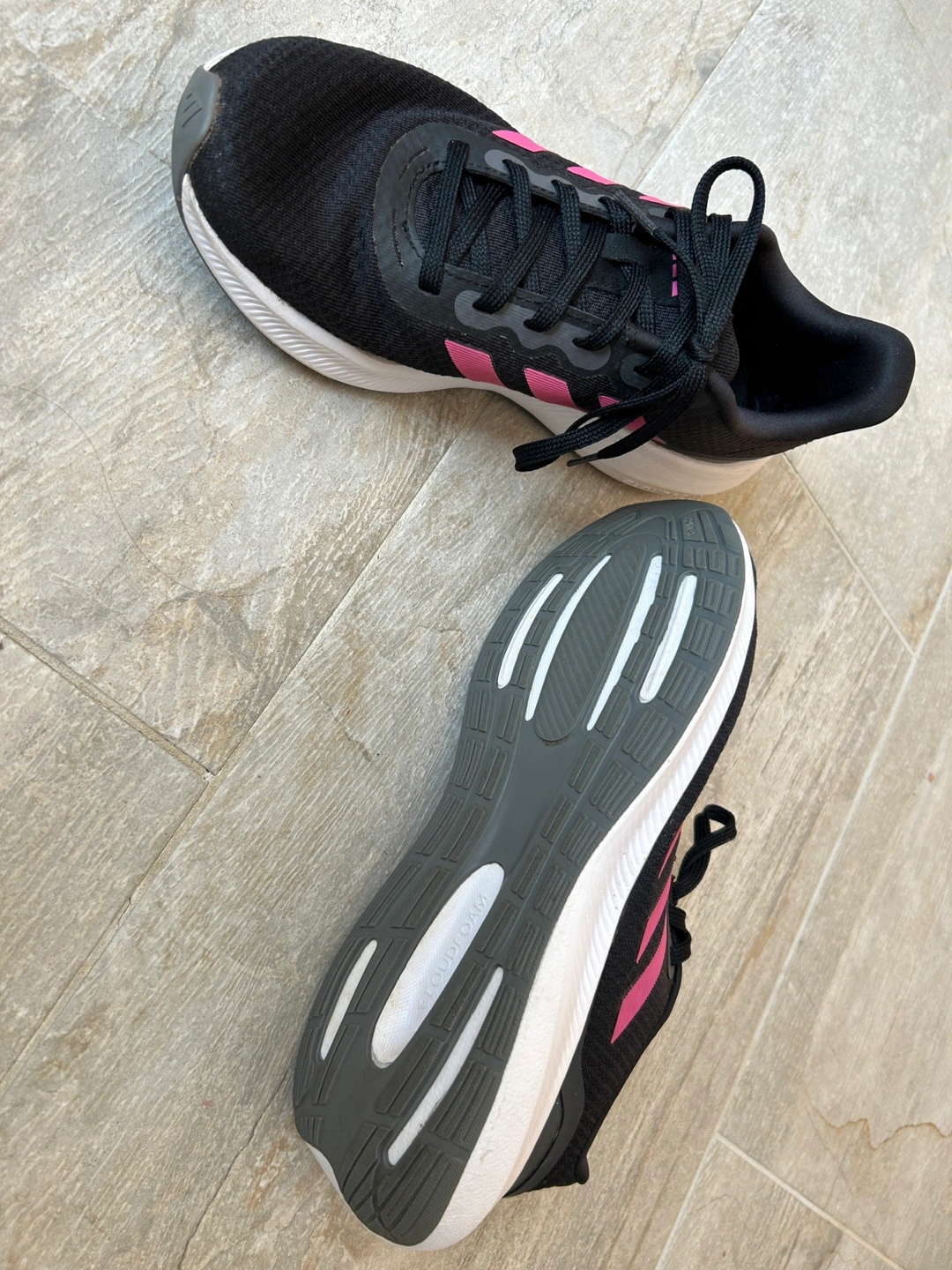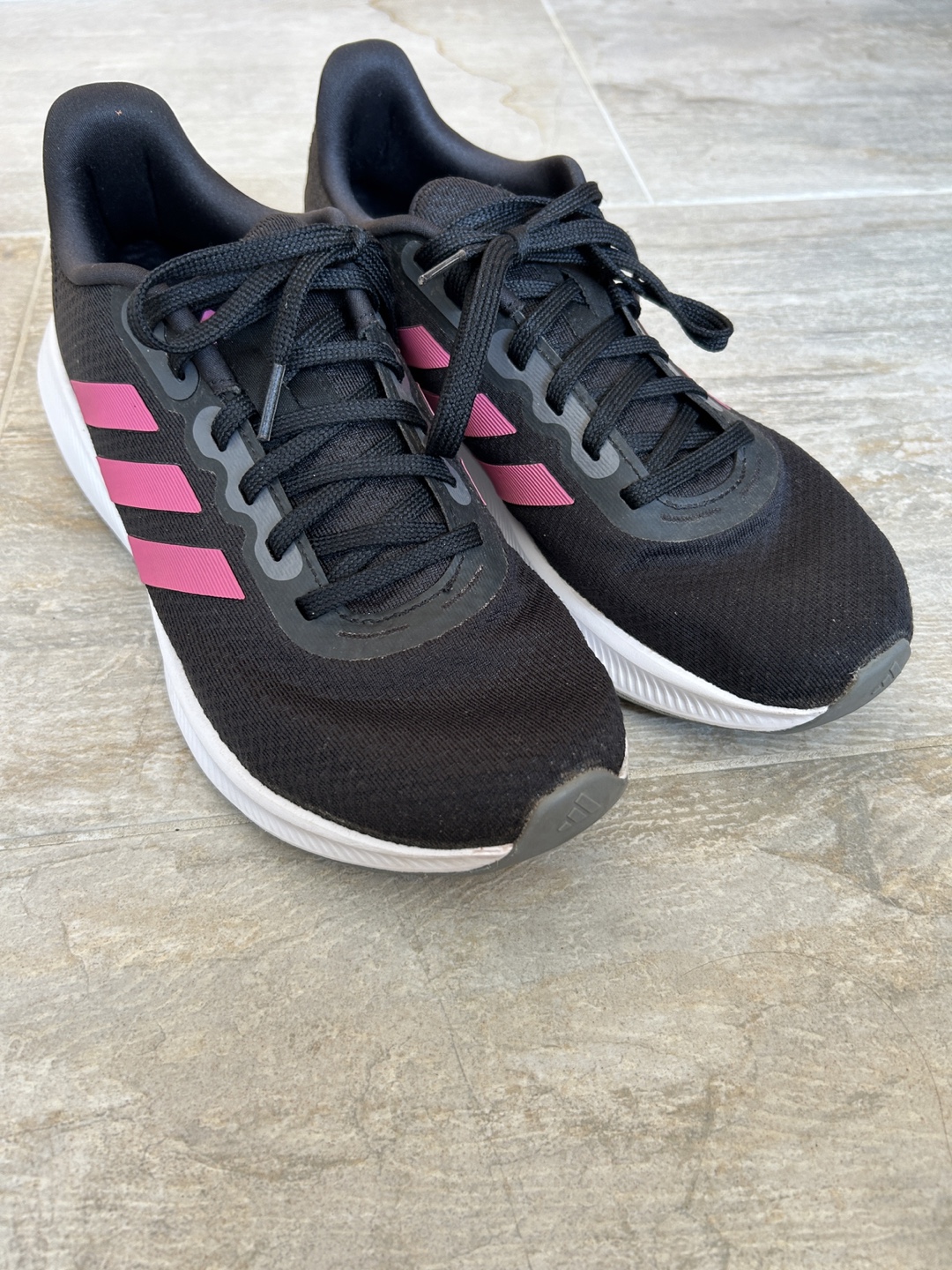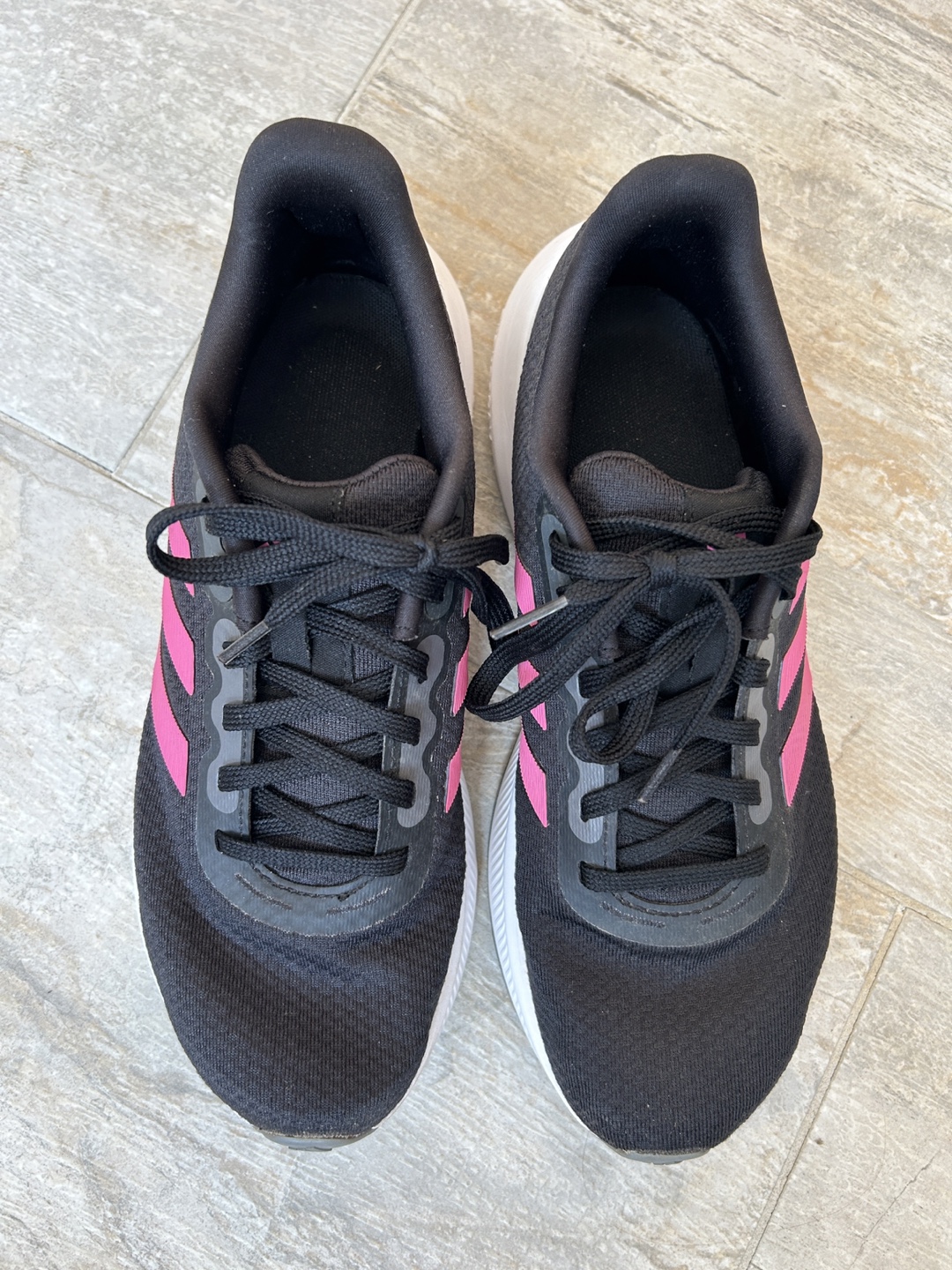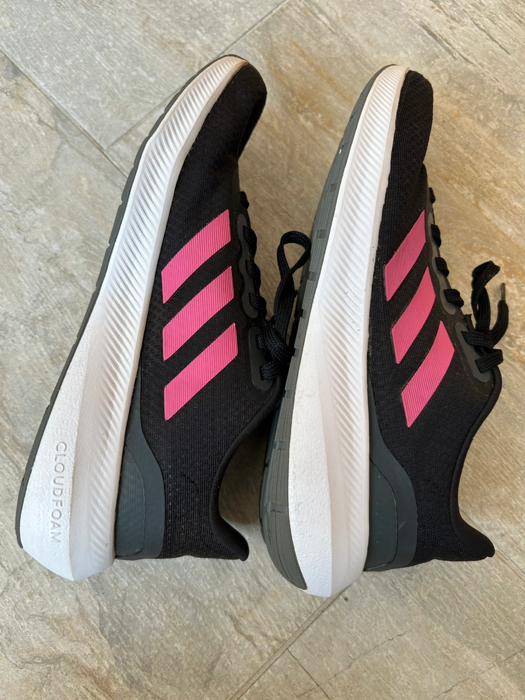 Selling a pair of Adidas running shoes in black with pink stripes. They feature a Cloudfoam sole for extra comfort. Great for everyday wear or hitting the pavement!