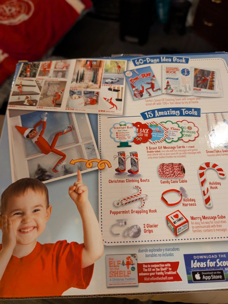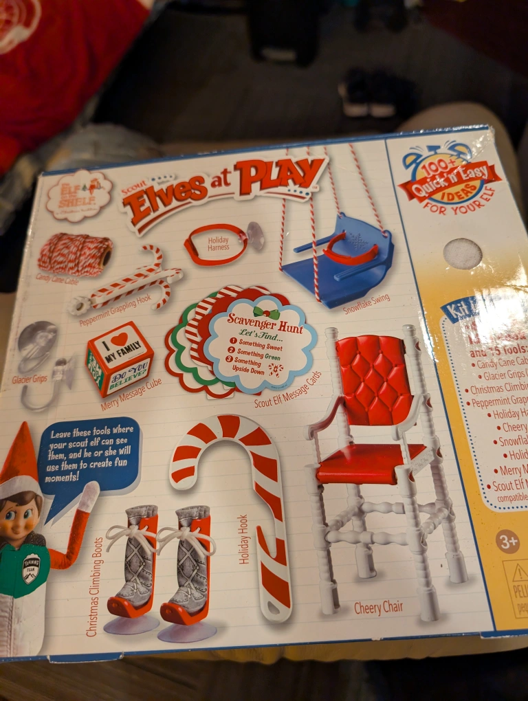 407Get ready for some fun with the Elf on the Shelf: Elves at Play kit! This kit includes a variety of accessories to create fun moments with your scout elf. It comes with: - Christmas Climbing Boots - Candy Cane Cable - Holiday Hook - Peppermint Grappling Hook - 2 Glacier Grips - Merry Message Cube - Scout Elf Message Cards - Snowflake Swing - Cheery Chair - Holiday Harness It also includes a 60-page idea book to inspire your scout elf with 100+ fun ideas to try at home