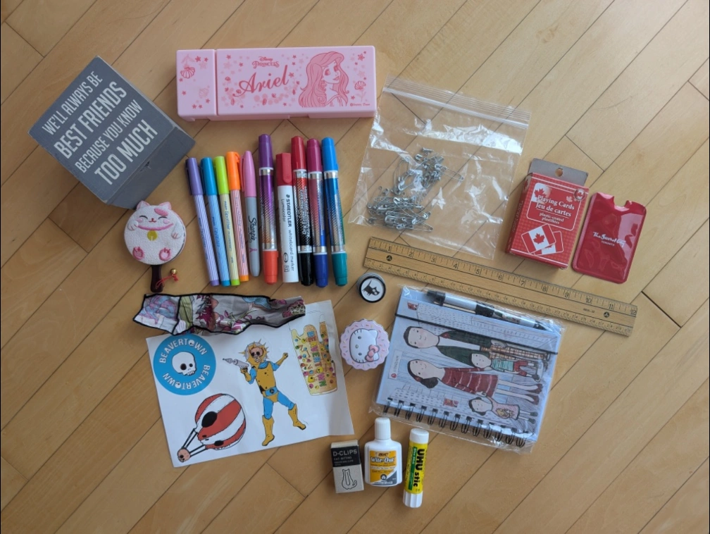 Giving away a mixed lot of stationary, playing cards, trinket boxes etc. Includes markers, pens, glue, stickers, pins, and more. The dry erase markers are double sided. If one side doesn't work, please try the other. ‼️PICK-UP ONLY 📍COLLEGE & YONGE 🛒ALL OR NOTHING 🗓️ Availability: 🍹 Weekends: 10:00 AM - 03:00 PM 💼 Weekdays: 2:00 PM - 3:00 PM, after 7:00 PM