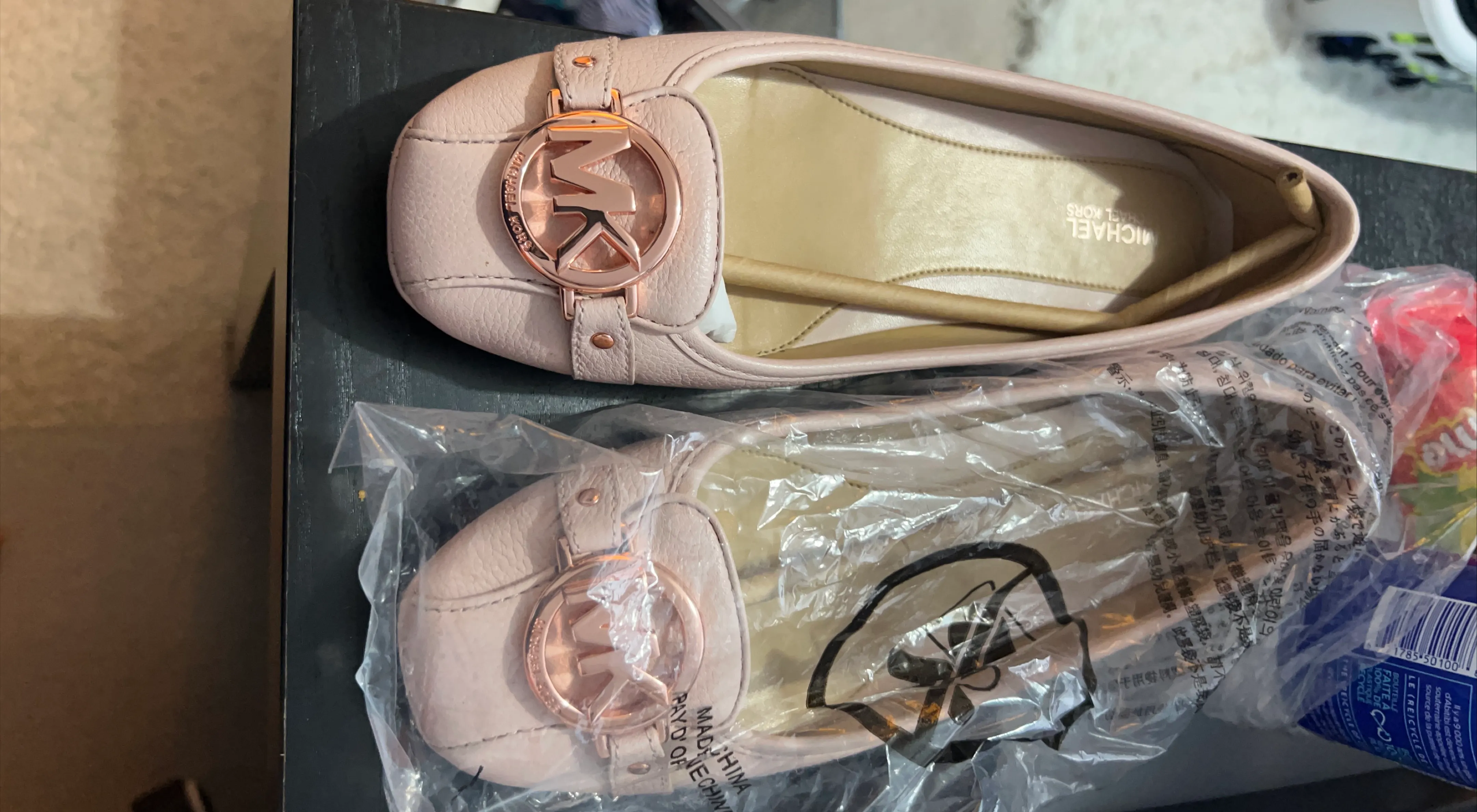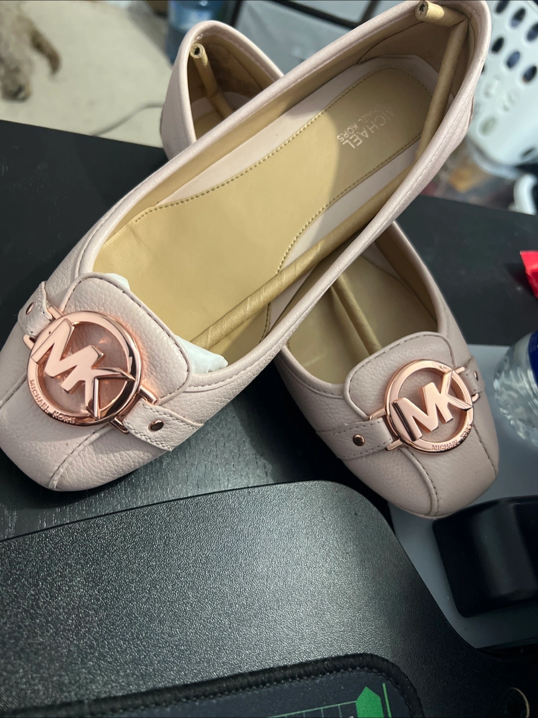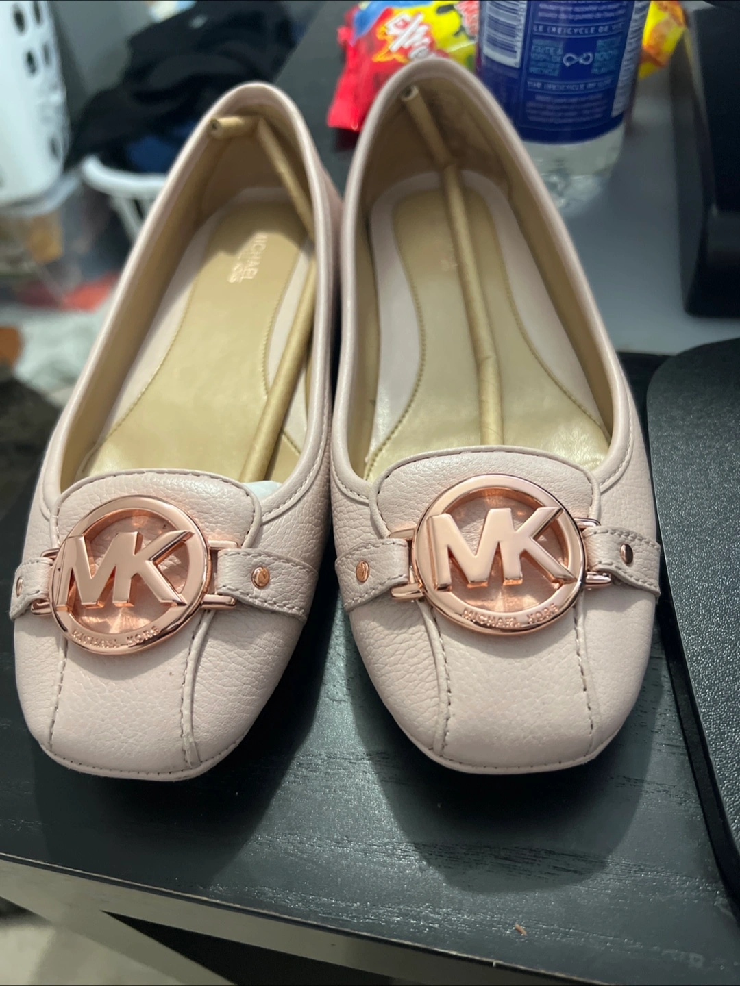 These are a pair of Michael Kors ballet flats in size 7. They're a lovely light pink colour and feature the MK logo. Perfect for adding a touch of elegance to any outfit!
