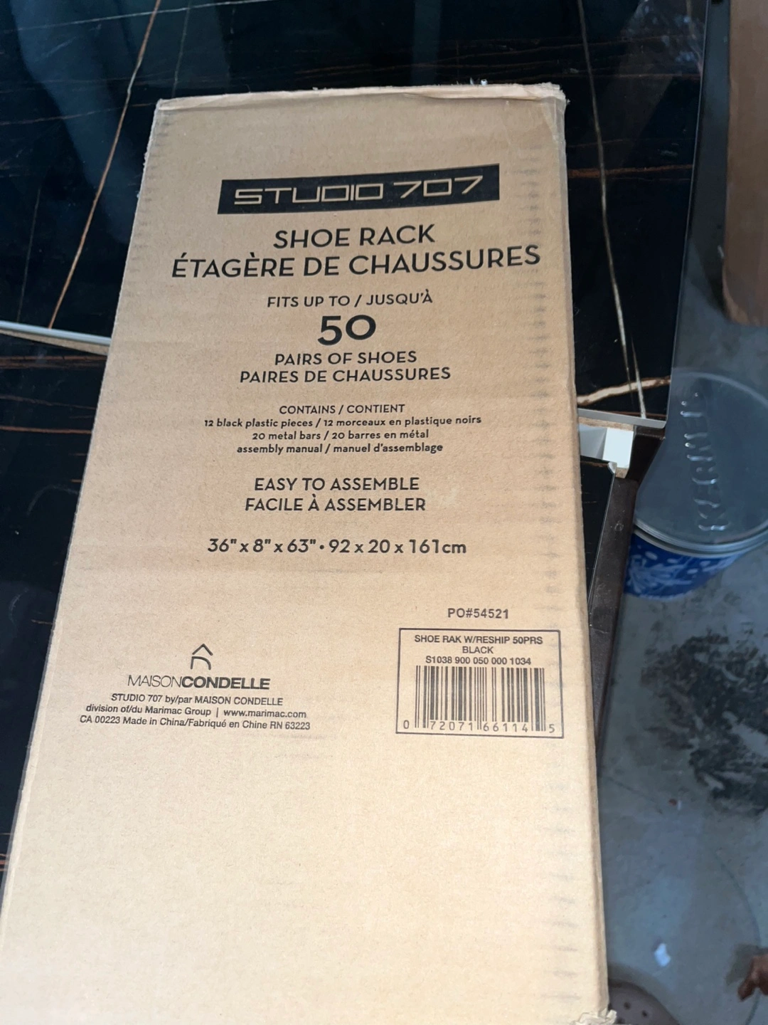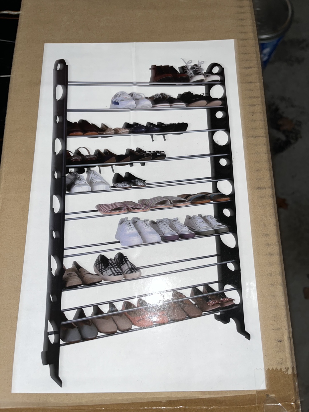 New in box. Holds up to 50 pairs of shoes. Black plastic and metal construction. Easy assembly.
