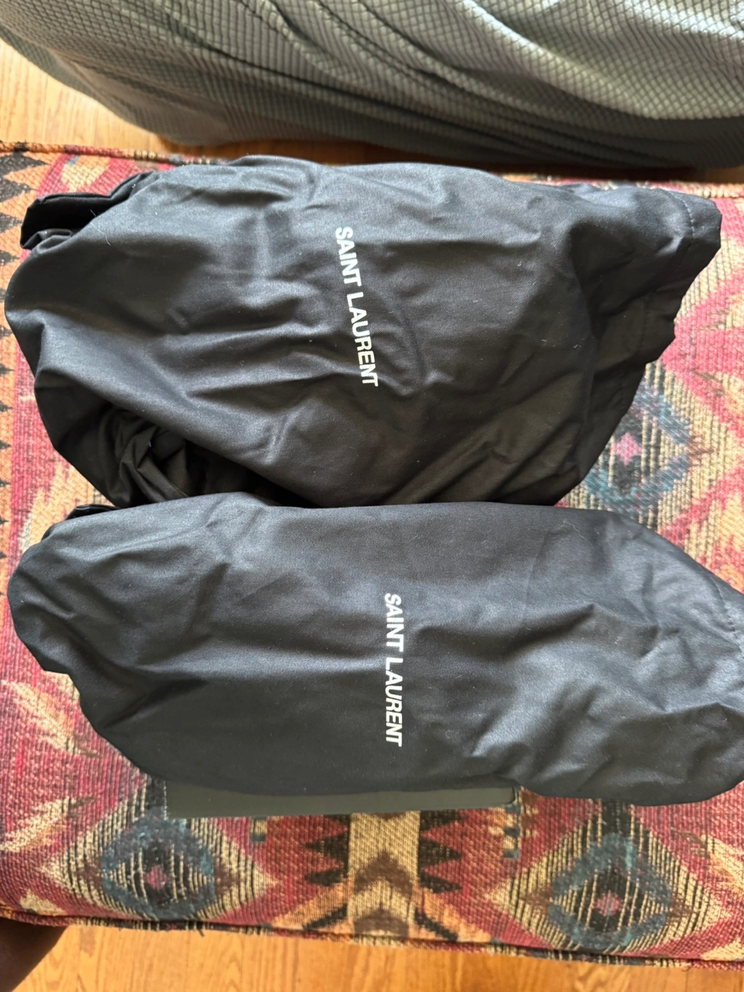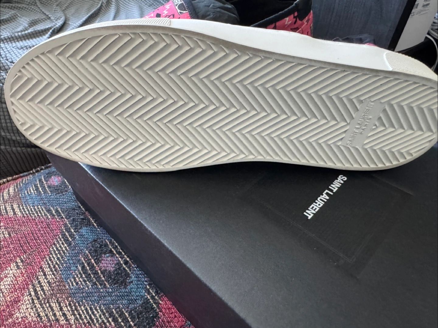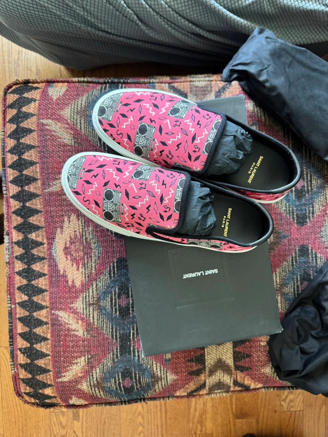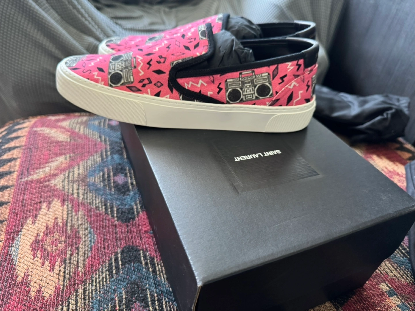 Selling a pair of Saint Laurent slip-on sneakers with a pink boombox print. They come with the original box and dust bags. Size 10 men 43