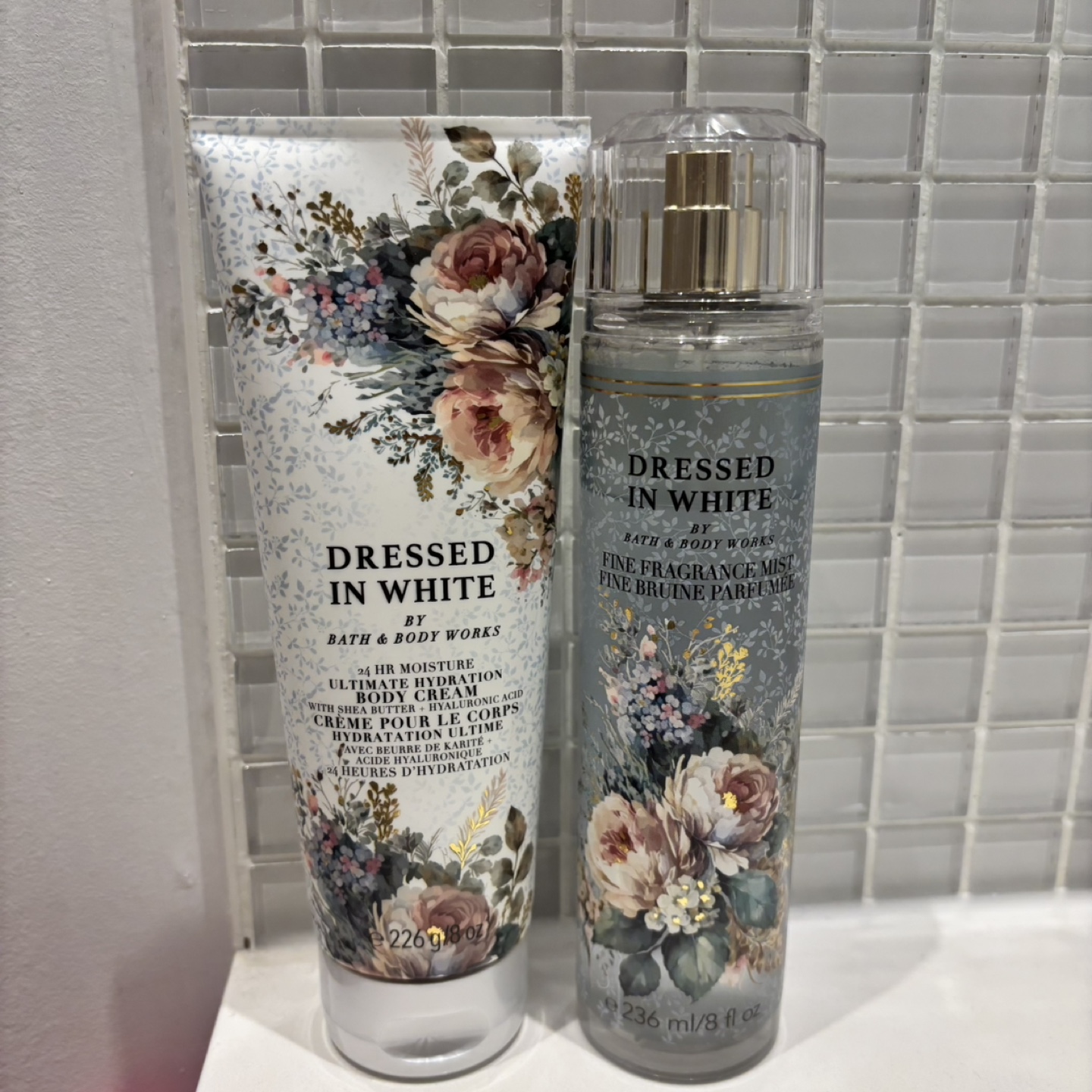 Selling a Bath & Body Works 'Dressed in White' set! This includes a 24-hour moisture ultra hydration body cream (never used) and a fine fragrance mist (85% left, see 2nd photo).