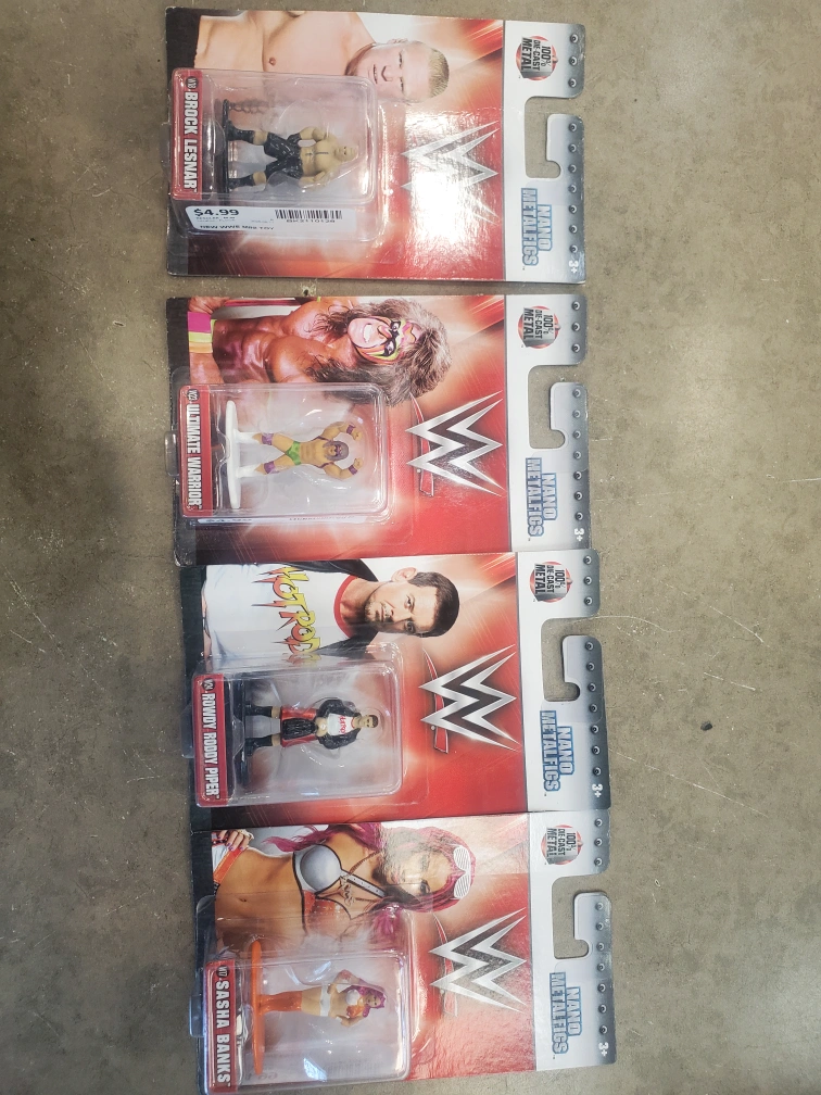 Selling a collection of WWE Nano Metalfigs! These are 100% die-cast metal and feature some legendary wrestlers: - Brock Lesnar - Ultimate Warrior - Rowdy Roddy Piper - Sasha Banks Perfect for any wrestling fan or collector!