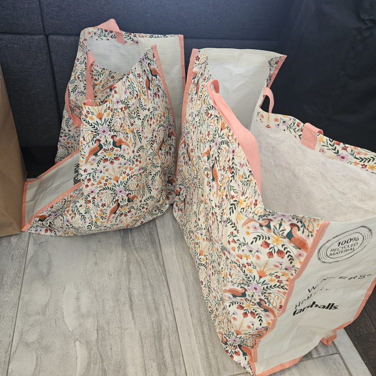 Selling a set of reusable shopping bags from Winners/HomeSense/Marshalls. They feature a lovely floral pattern with birds and are made from 100% recycled material. Perfect for your grocery trips or errands! One of them has a stain inside