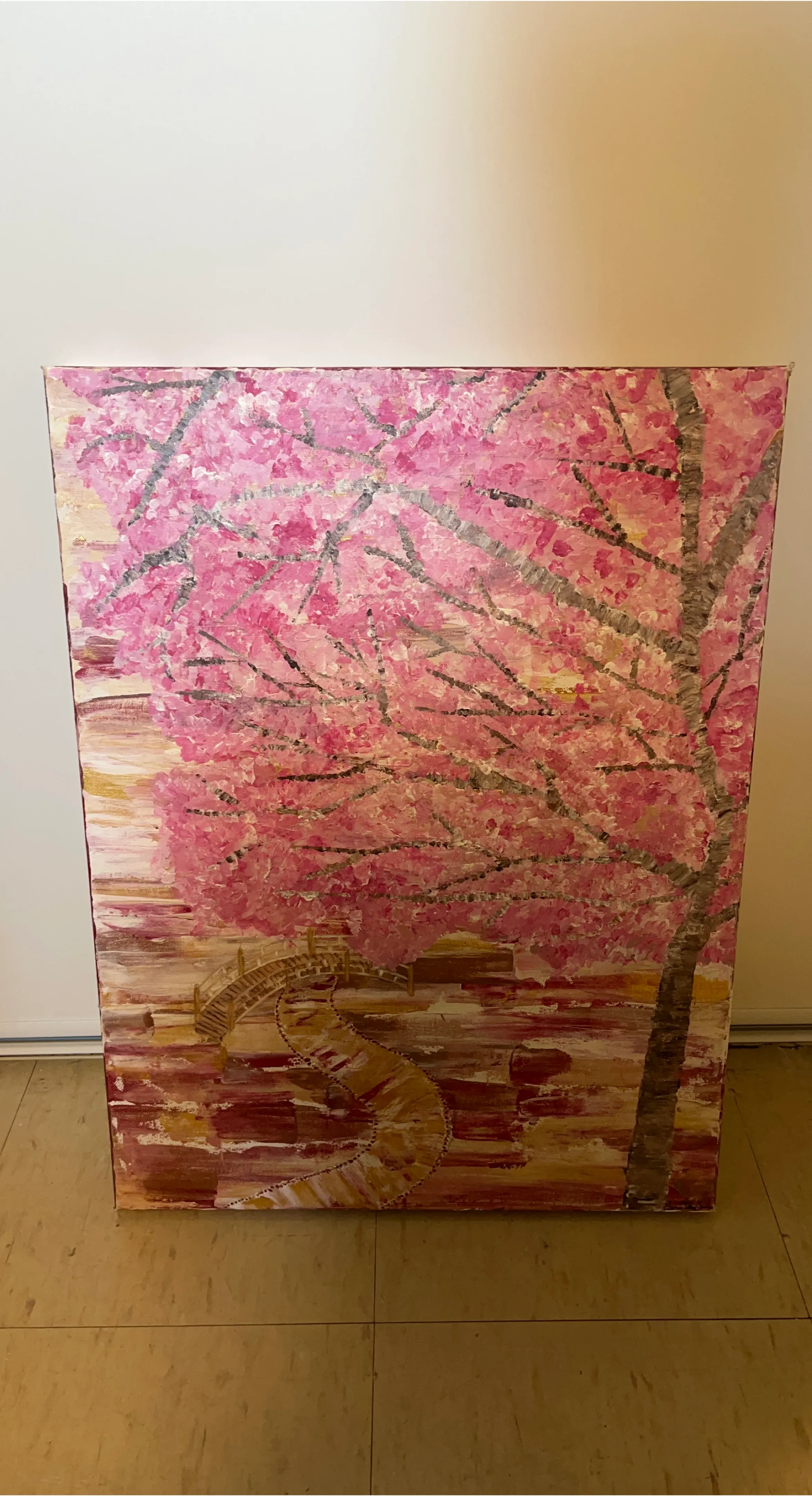 Selling a lovely painting of a cherry blossom tree. It's a beautiful piece that would add a touch of spring to any room. The painting is on canvas with a wooden frame.