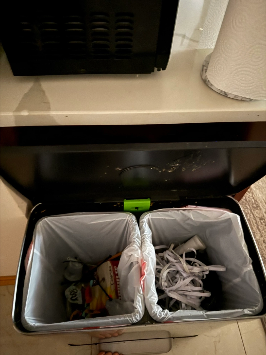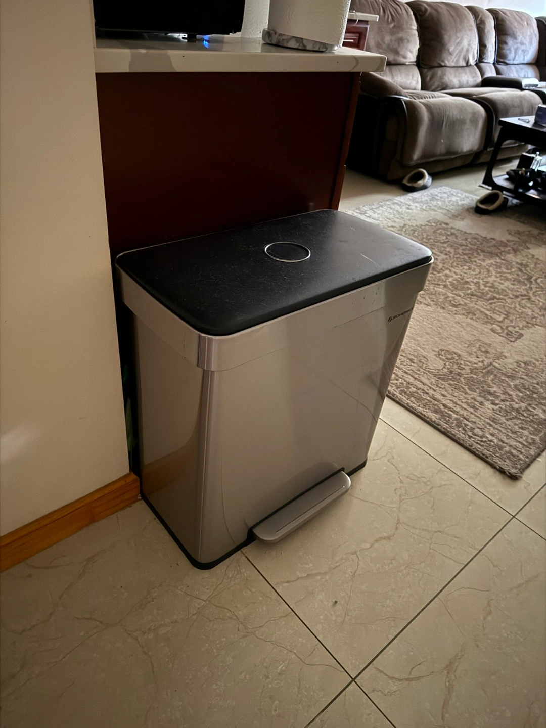 Selling a used stainless steel step trash can. It's in good condition and perfect for any kitchen or bathroom. The step pedal makes it easy to open, and the stainless steel finish is easy to clean. Great for separating trash and recycling! It's a practical and durable option for your home