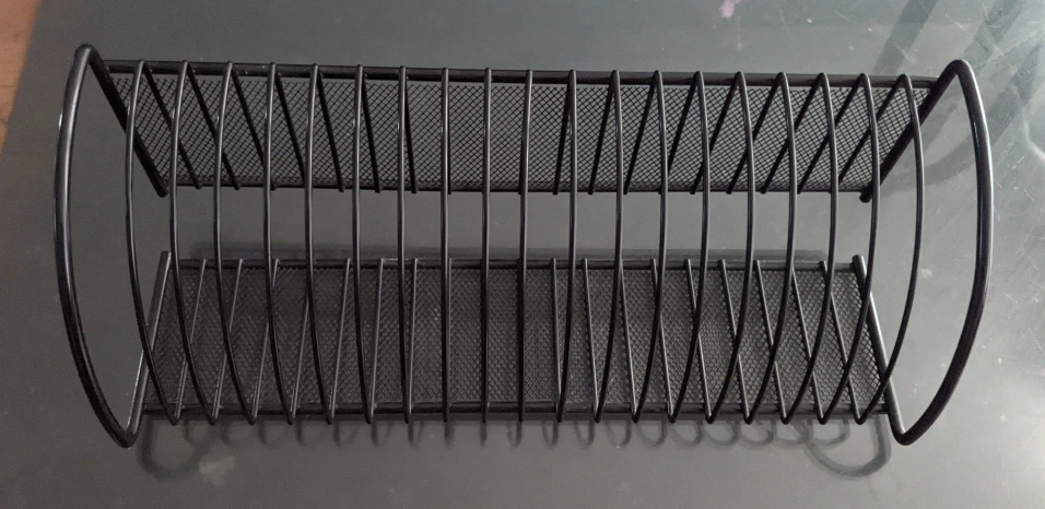 Here's a handy black metal organizer rack. It's great for organizing office. The metal mesh design is simple and functional, and it's in good condition.