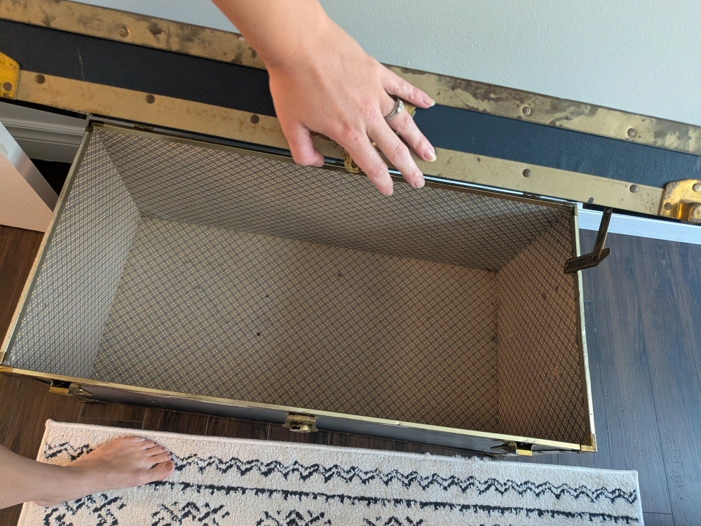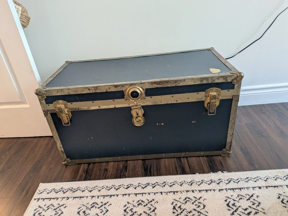 measures 31" wide * 16.5 " deep x 17" tall navy blue with worn/rusty gold hardware detail pickup only on McCaul st Toronto tags home storage trunk retro vintage coffee table blue apartment condo house student living budget
