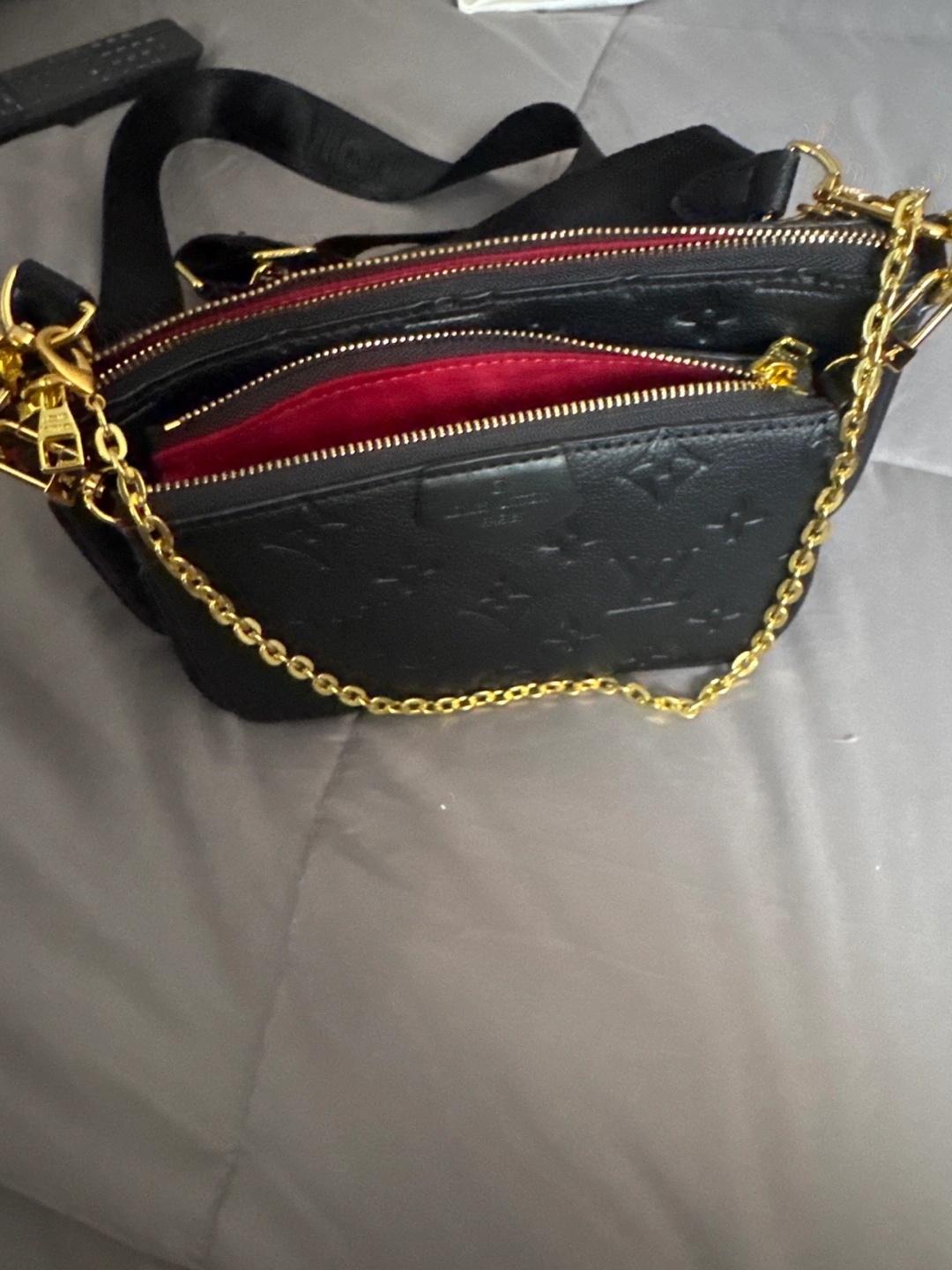 This is a Louis Vuitton REPLICA Multi Pochette Accessoires in black. It comes with the original dust bag. The bag features a detachable round coin purse and a detachable, adjustable strap for versatile wear. It has a gold chain that is removable