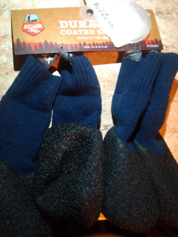 for your Dogg I'm selling a brand new pack of Arcadia Trail durable coated socks ! They are designed for the freedom to explore and made with lightweight material. The size is 2.5 in (6.3 cm), and there are 4 socks in the pack