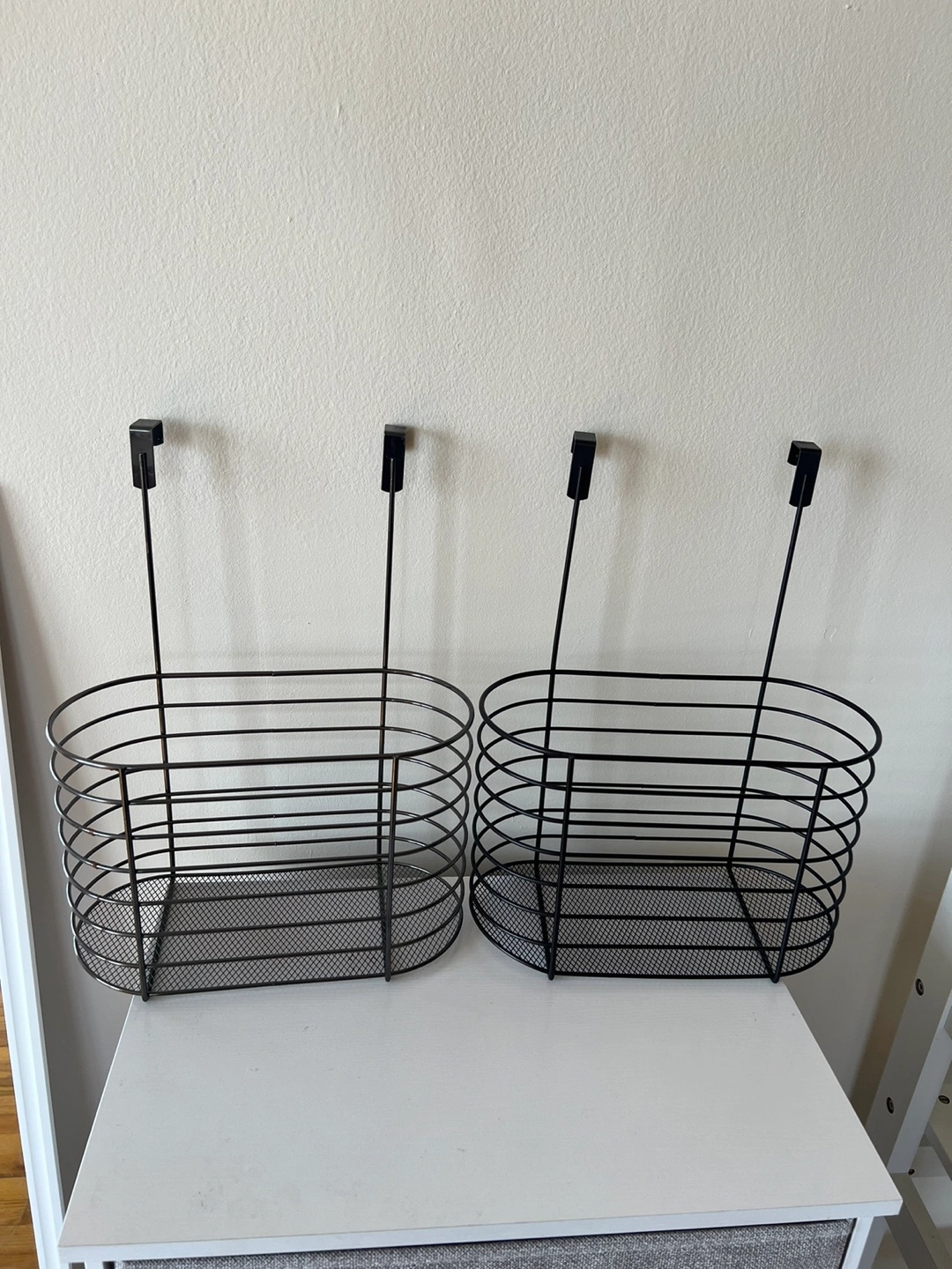 Selling a set of two black wire baskets designed to hang over cabinet doors. They're perfect for adding extra storage in your kitchen or bathroom. The baskets are in great condition and ready for a new home!