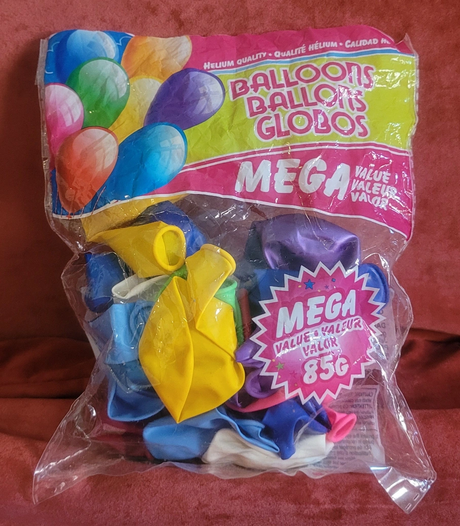 Here's a pack of Mega Balloons, opened in the original packaging! Perfect for parties or any celebration. The pack is 85g and includes a variety of colours