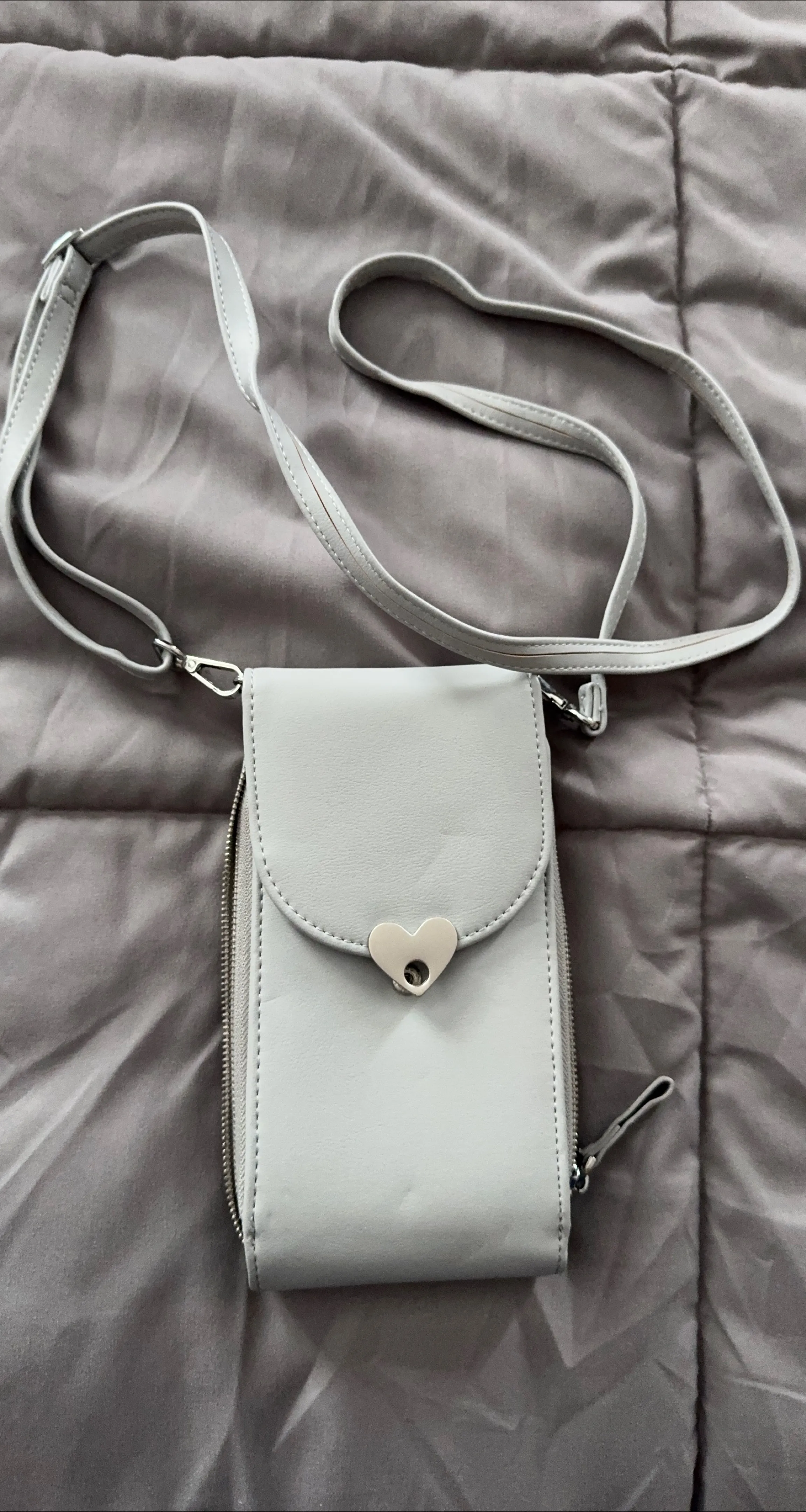 This is a cute grey crossbody bag perfect for holding your cellphone and a few essentials! It features a heart-shaped detail on the front. The interior has slots for cards and a zippered compartment for change or other small items. It's lightweight and portable, making it great for on-the-go use