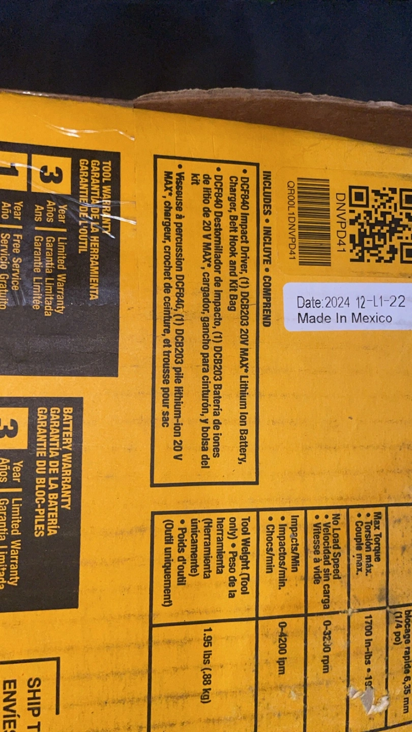 Selling a Dewalt DCF894D1 20V MAX* Lithium Ion Impact Driver Kit. It includes the DCF894 Impact Driver, a DCB203 20V MAX* Lithium Ion Battery, charger, belt hook and kit bag. The box is included! It has a variable speed of 0-3200 ipm.