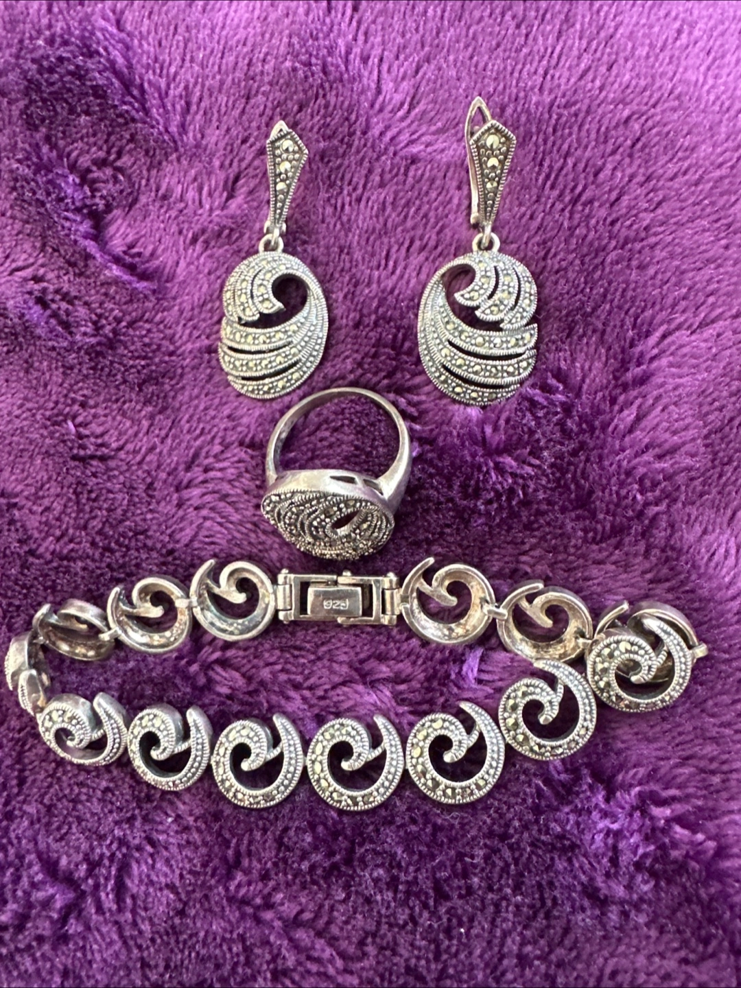 132Selling a beautiful jewellery set featuring marcasite stones. Includes a bracelet, ring, and a pair of earrings. The set has a lovely, classic design and would make a great addition to any collection!