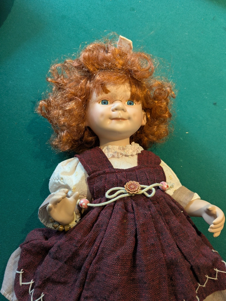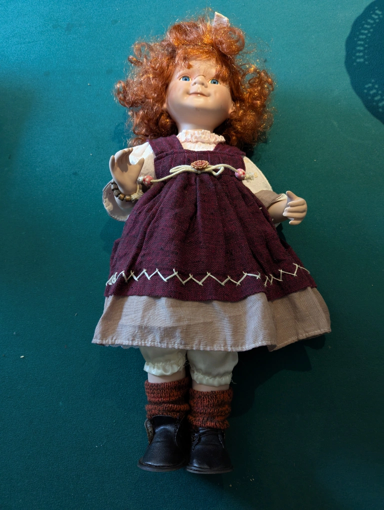 This is a charming doll with vibrant red hair and blue eyes. She's wearing a burgundy dress with white detailing and little black shoes. A sweet addition to any doll collection!