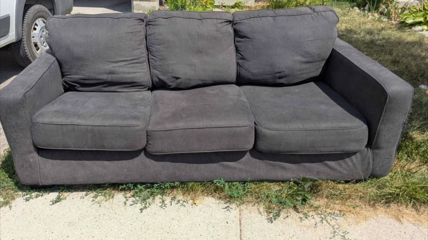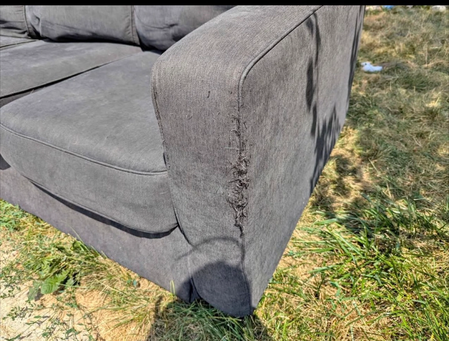 Selling a grey sofa that has some wear and tear on the arm. It's still comfy and has lots of life left! Would be great for a rec room or someone just starting out